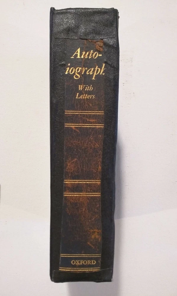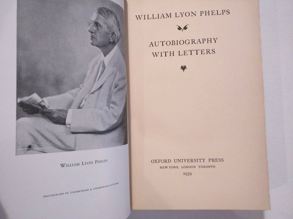 William Lyon Phelps Autobiography with Letters, Signed 1939 Gift Edition Stated 7th Printing Old Leather Edition Publisher: Oxford University Press Good with black book tape reinforced to spine - 8 3/4" x 5 7/8" - 982 numbered pages Desc: Signed by William Lyon Phelps to Gift Page as shown. Sturdy blue leather boards with dulled gilt top pages, shows wear to corners and spine ends with black cloth book tape over a worn spine as pictured - book remains very sturdy. Clean intact interior with b/w photos. Please Note: Payment for this item is appreciated upon the sale. PLEASE ask all questions prior to purchase Many thanks! ECHO Vintage Books & Vinyl