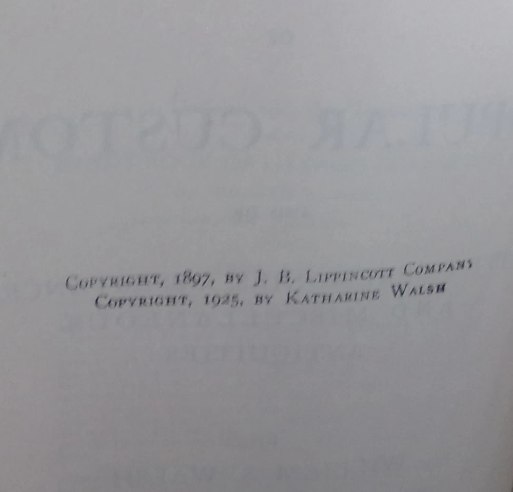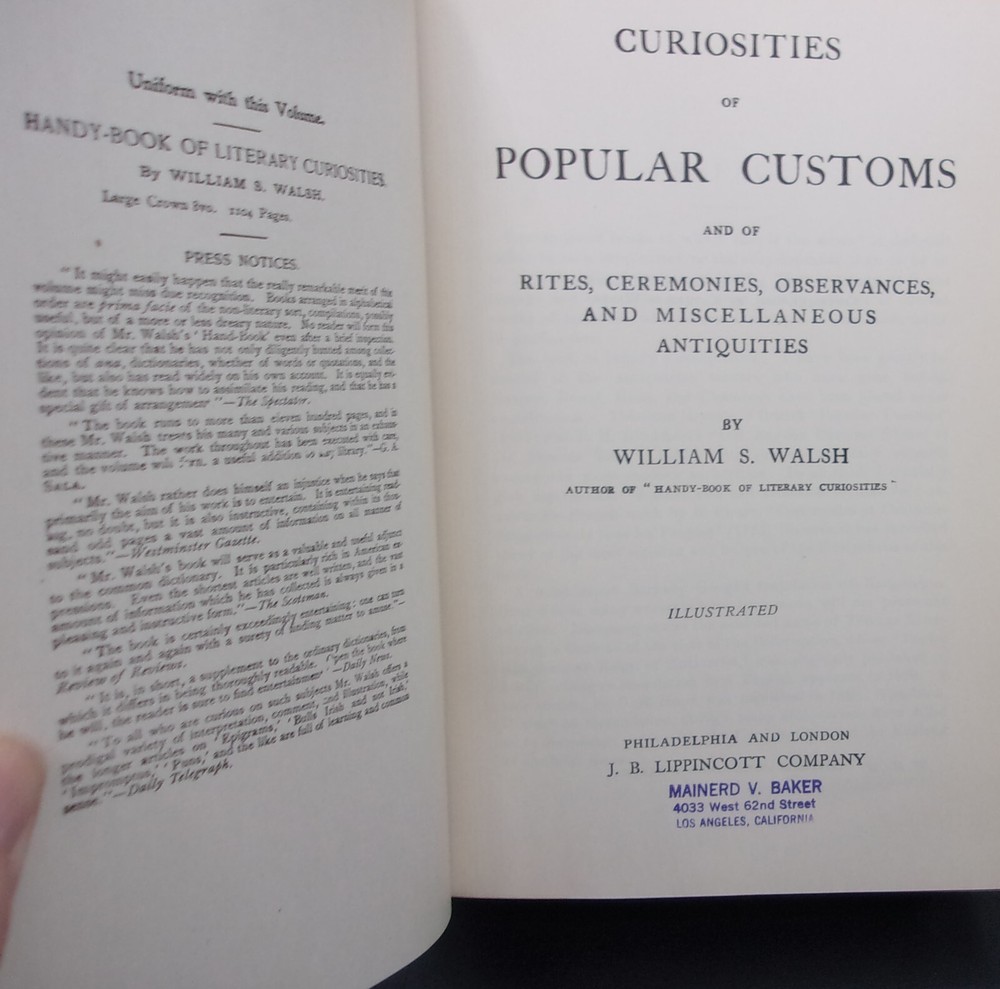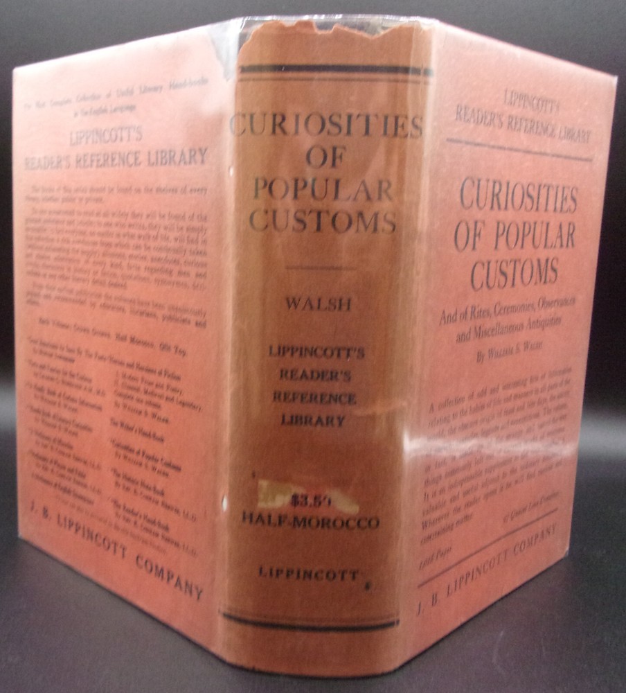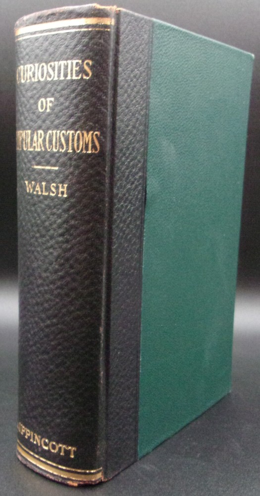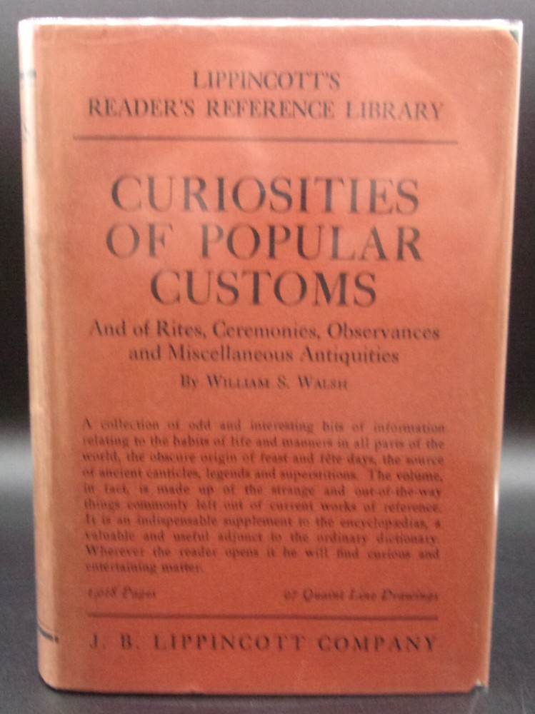 CURIOSITIES OF POPULAR CUSTOMS And of Rites, Ceremonies, Observances and Miscellaneous Antiquities by William S. Walsh Philadelphia and London: J.B. Lippincott Company, (1925). Copyright renewed edition of the original 1897 edition. Gilt-stamped black half-morocco over dark green cloth; in the original orange printed dust jacket. Minor wear to the spine ends, else near fine; in a very good plus dust jacket with light chipping to the crown of the spine, small abrasion to the spine, small piece missing from the upper rear panel, and flap folds have minor chipping to the corners. This massive (1018 page) volume, published in Lippincott's Reader's Reference Library series, is an alphabetically listed collection of "odd and interesting bits of information relating to the habits and manners of all parts of the world, the obscure origin of feast and fete days, the source of ancient canticles, legends and superstitions."--publisher. Thick octavo. 97 quaint line drawings. PLEASE VIEW FOR MORE GREAT BOOKS THANKS!