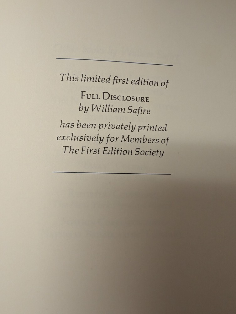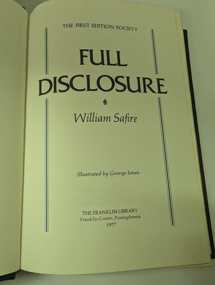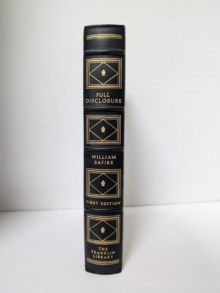 This sale is for a First Edition Full Disclosure by William Safire. Published by The Franklin Library, 1977. Printed Exclusively for the Members of The First Edition Society. Book Condition Very Good. Tight binding, sharp corners, clean edges, sharp spine ends, clean interior, there are a couple of tiny nicks in the gold on the bottom page edge, and fading around the edges of the blue sild endpapers. Leather bound in black with gold embellishments and gold page edges.. Shipped within 48 hours. Expertly packaged. We are new to Ebay, but have been in the book business for more than a decade. Buy with confidence. Brick and mortar store in Canton, Ohio. Google us to ensure our credibility. A Cornucopia of Cool Books.