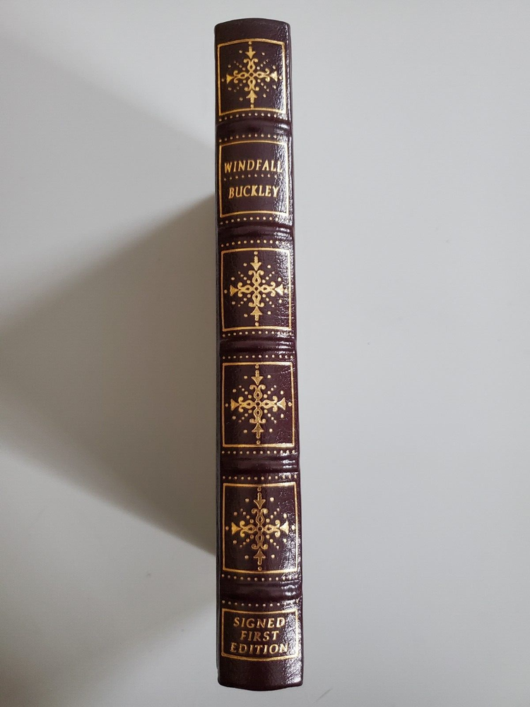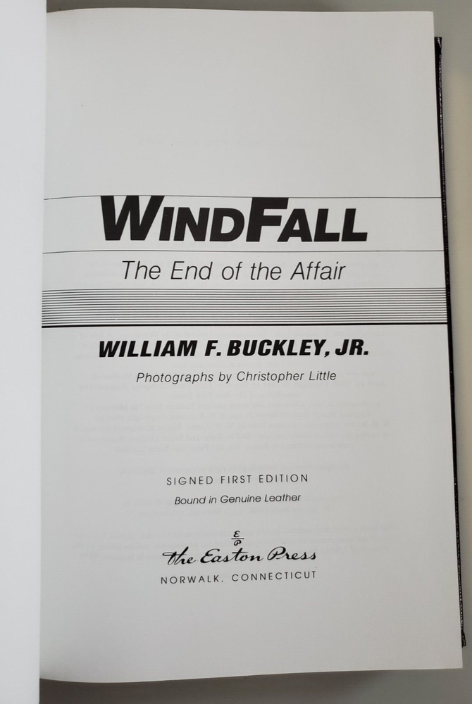 Windfall: The End of the Affair by William F. Buckley, Jr. Like new Easton Press Signed First Edition. This hardcover book boasts the features that are expected from Easton Press: signed by the author, bound in genuine leather, with gold lettering and decorations on the cover and spine, gilded page edging and a sewn-in satin bookmark. Decorative pattern is the same on front and back cover. The text is printed on archival quality acid-neutral paper. These books are a pleasure both to display and to read.