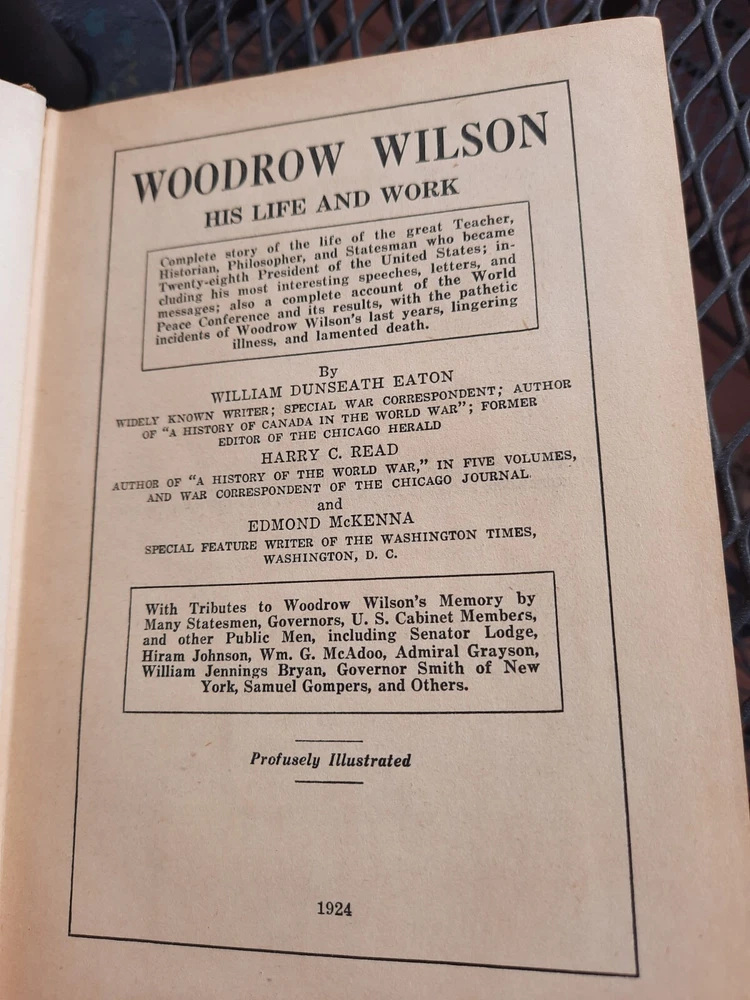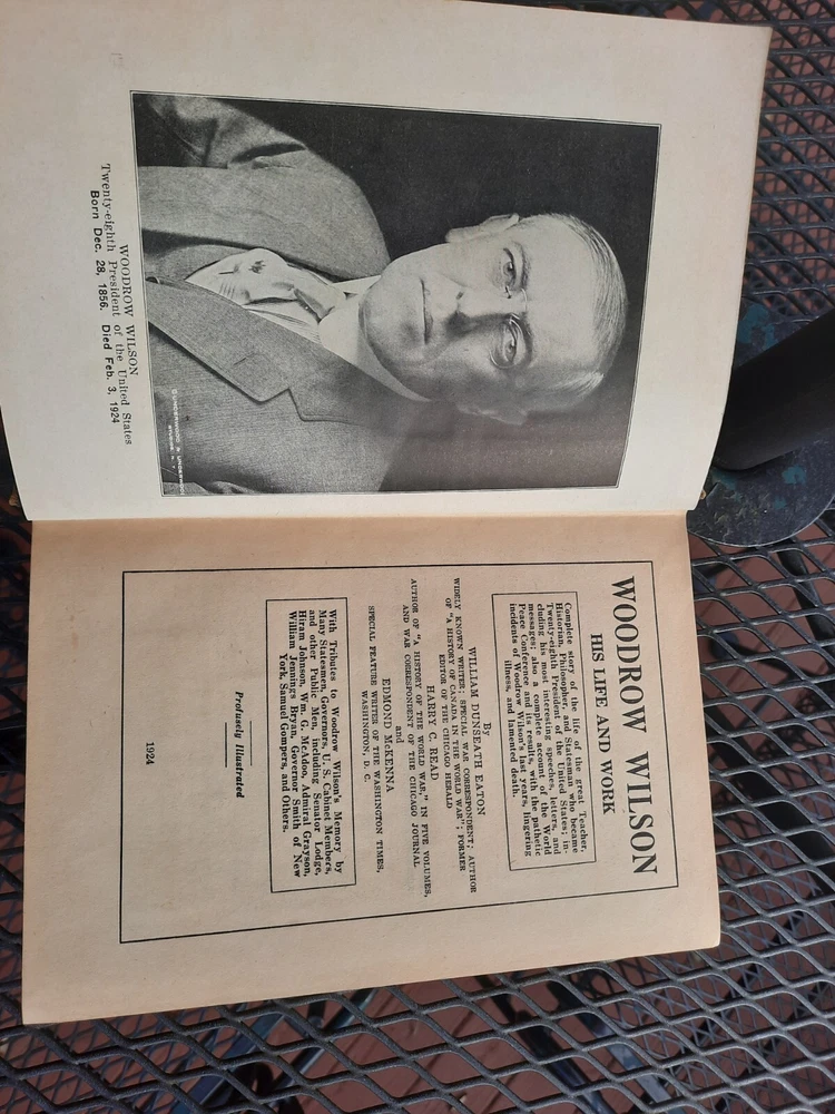 Woodrow Wilson His Life and Work, Leather Hard Cover 1924 EUC!! Book is in amazing condition to be almost 100 years old with no writing, highlighting or missing pages. The cover shows a normal amount of wear. The binding is fully intact as shown. Antique book detailing the life of Woodrow Wilson. United States 28th President. He won the Democratic nomination of 1912 beating out President Taft and Roosevelt. 720 pages. Measures 8 1/4 in length. 6 width. Just a fascinating book in very good condition. Rare and historic book that will make a nice addition to your home library collection. See pics and bid/buy with confidence on a fast, hassle-free transaction. Ships next day FREE within the USA through USPS Media Mail with tracking number provided to the winner.