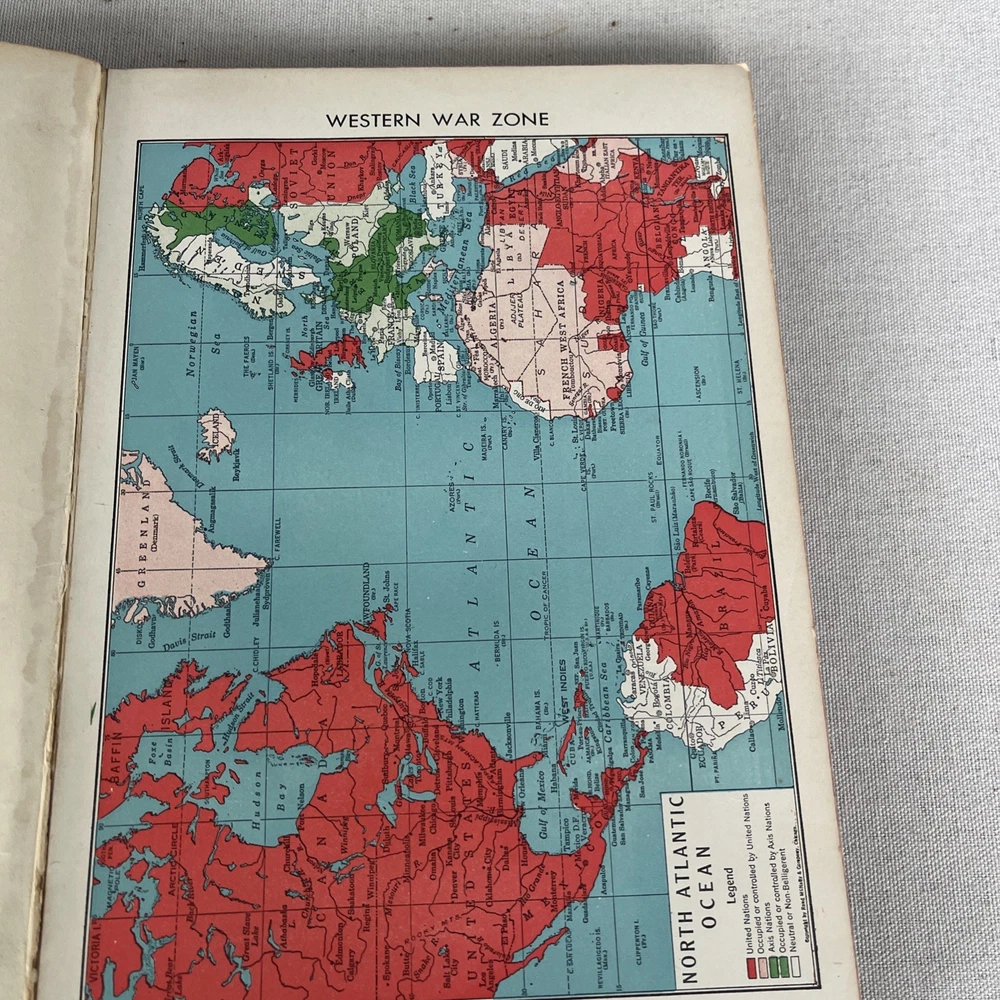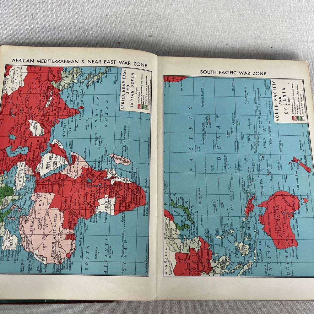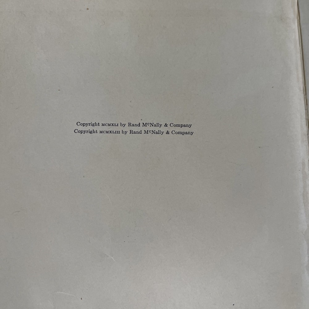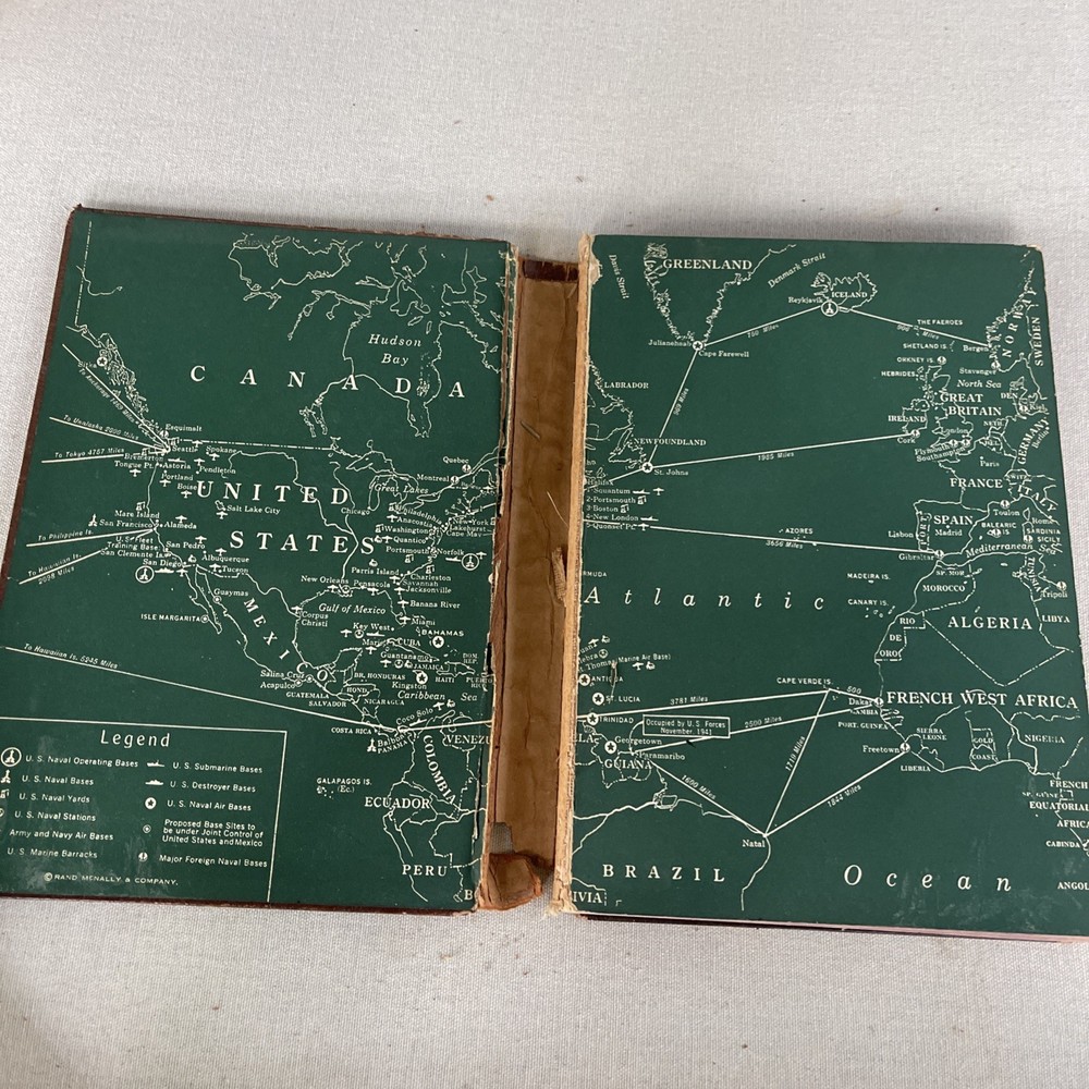 This is a rare and valuable find for collectors and history enthusiasts alike. This 1943 World Atlas by Rand McNally & Company features the war zones of WWII and is a must-have for anyone interested in historical geography. The atlas is beautifully bound in leather and personalized, making it a unique addition to any collection. The publisher, Rand McNally & Company, is known for producing high-quality atlases and this original piece is no exception. The atlas covers various topics including maps, globes, and cartography, and is a valuable resource for anyone interested in reference books. This piece was printed in 1943, making it a piece of history in itself. Cover shows wear, see pictures. Pages of book in good clean condition.