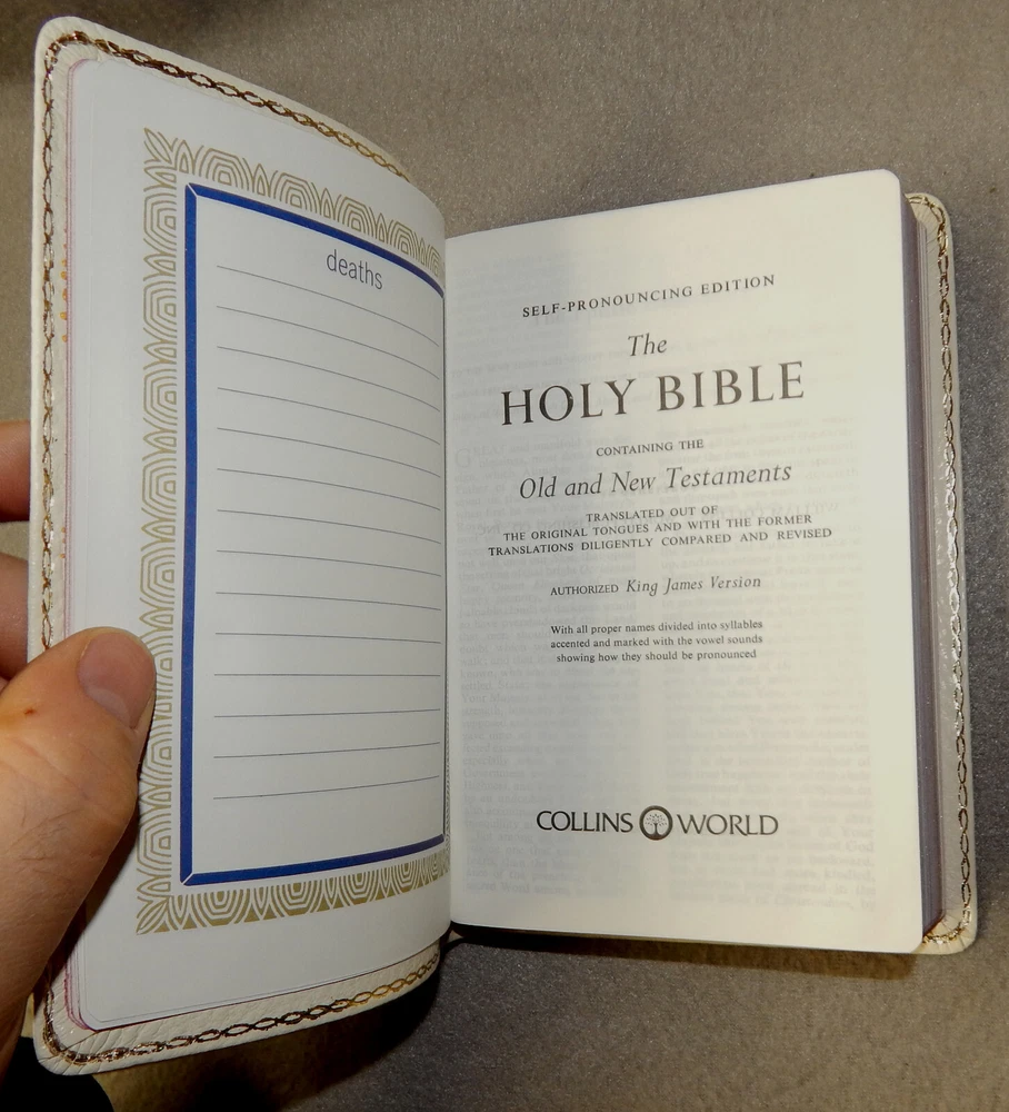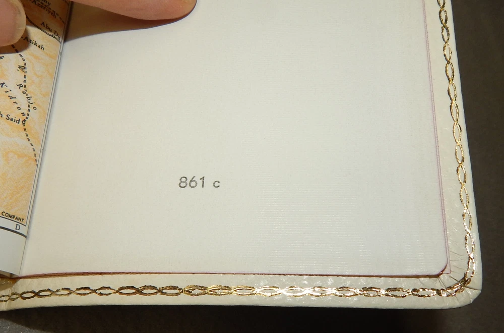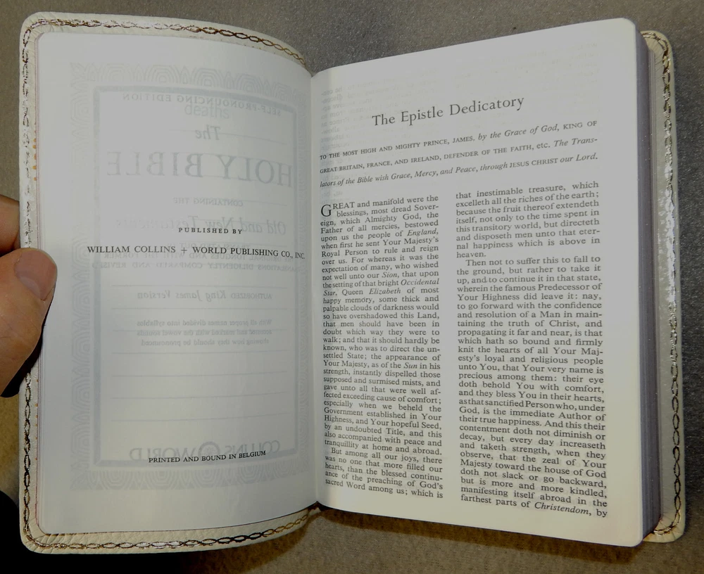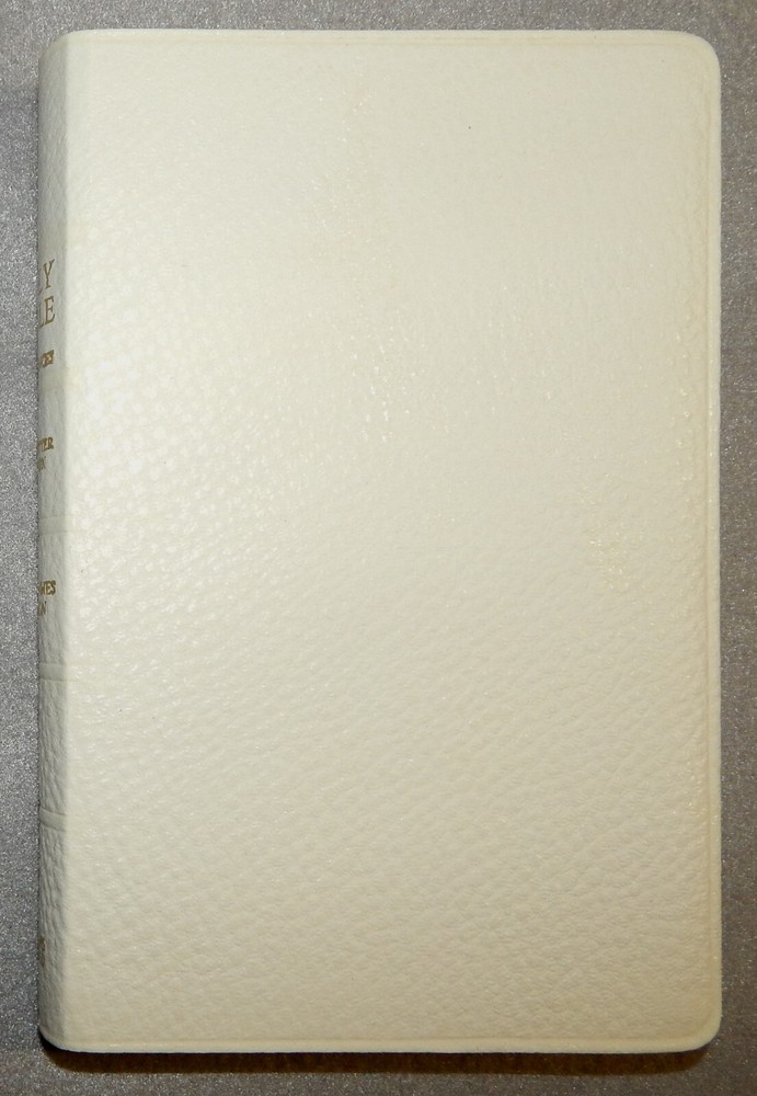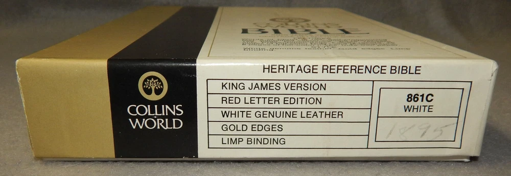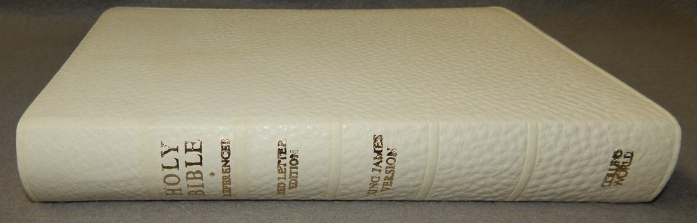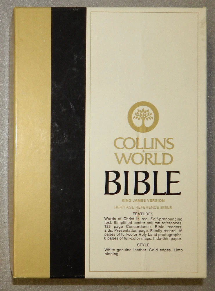 World KJV Heritage Reference Bible White Genuine Leather Collins World 861C Words of Christ in Red Gold Edges Self-pronouncing text Simplified center column references 128 page Concordance Bible readers aids Presentation page Family record 8 pages of color maps Inda-thin paper 5" x 7 1/4" x 1 1/4 inches thick By comparison, it seems to be about 9.5pt I assume printed in the early 1970' (based on box and 'Collins World') New - wrapped in paper in original box (pictures of the pages are from an opened shelf copy)