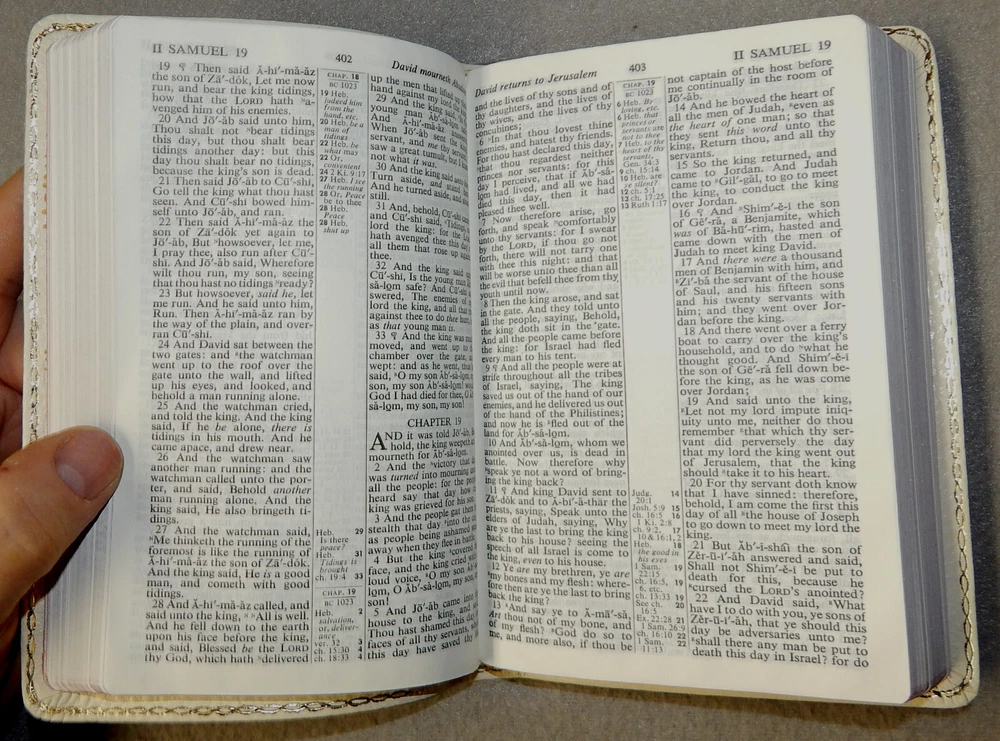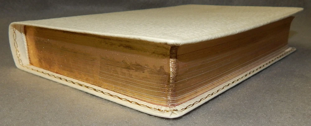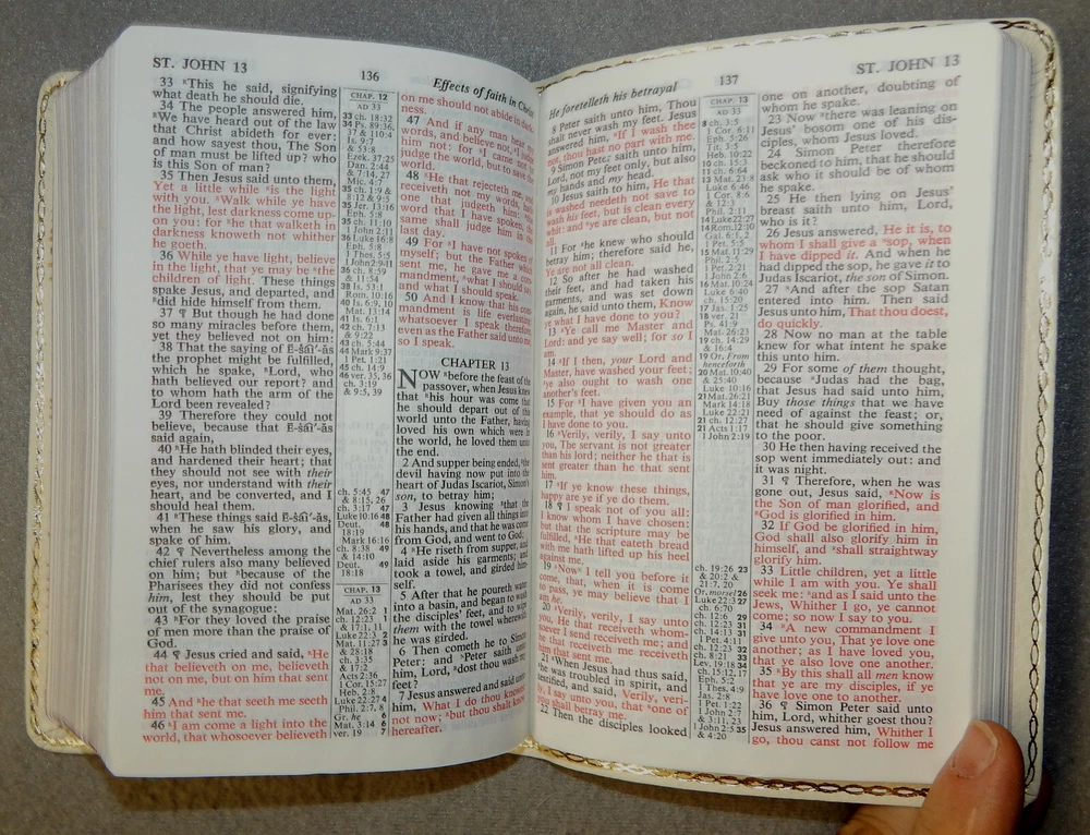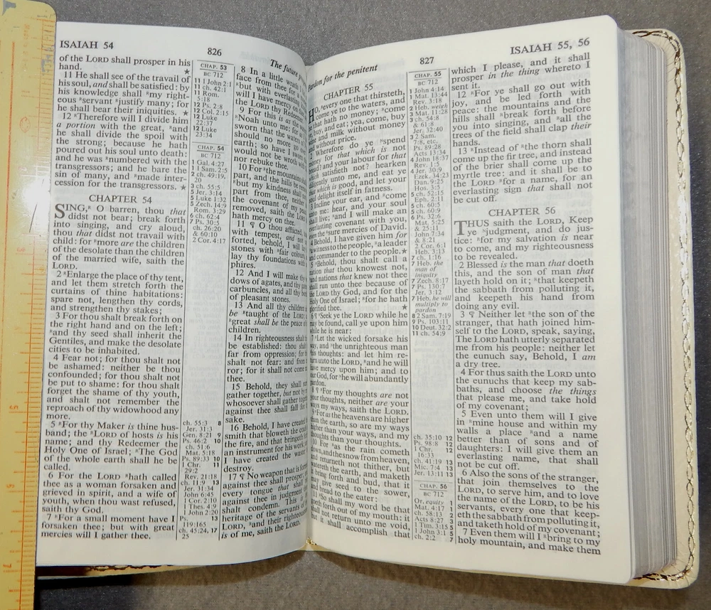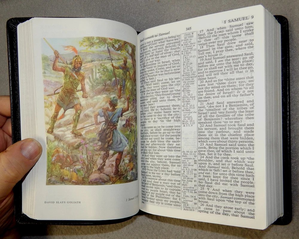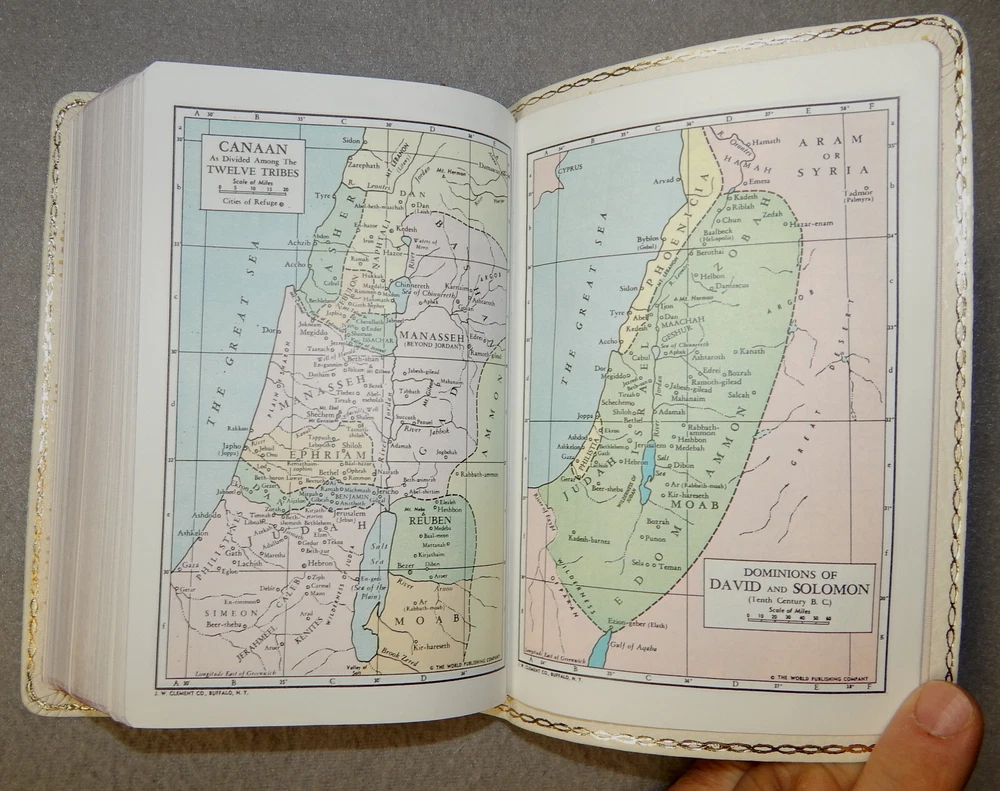 World KJV Heritage Reference Bible White Genuine Leather Collins World 861C Words of Christ in Red Gold Edges Self-pronouncing text Simplified center column references 128 page Concordance Bible readers aids Presentation page Family record 8 pages of color maps Inda-thin paper 5" x 7 1/4" x 1 1/4 inches thick By comparison, it seems to be about 9.5pt I assume printed in the early 1970' (based on box and 'Collins World') New - wrapped in paper in original box (pictures of the pages are from an opened shelf copy)