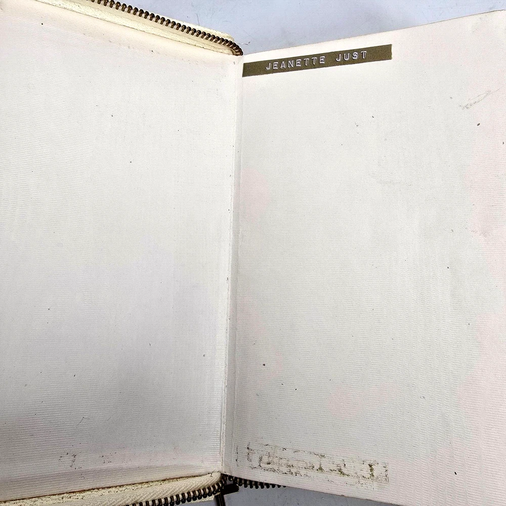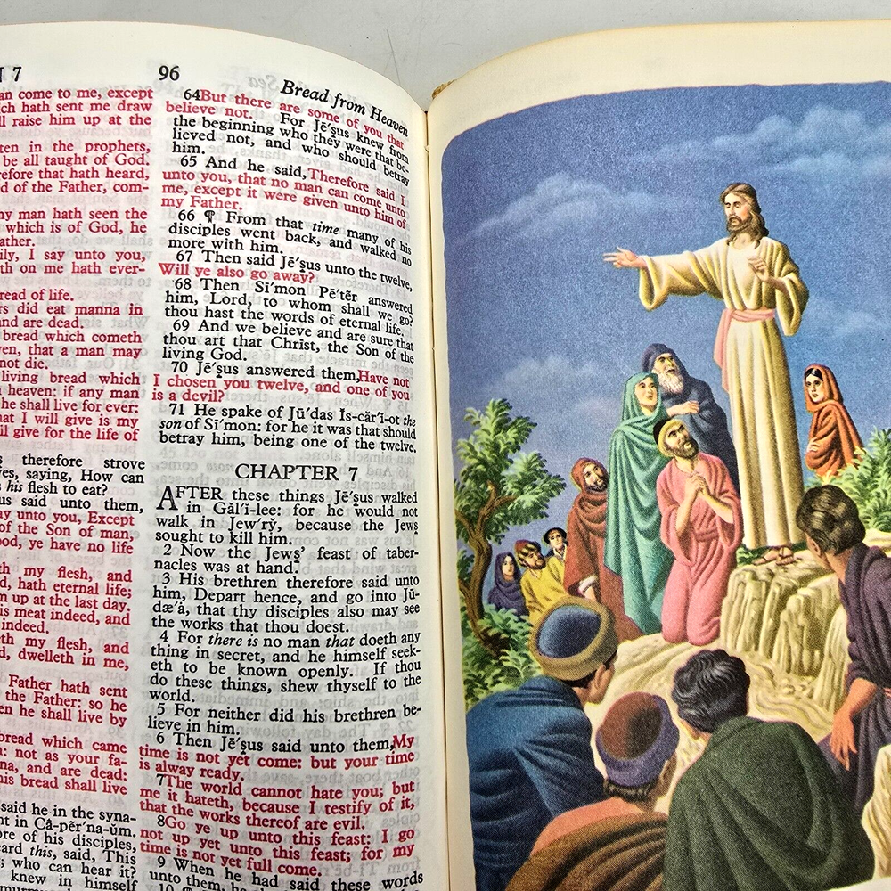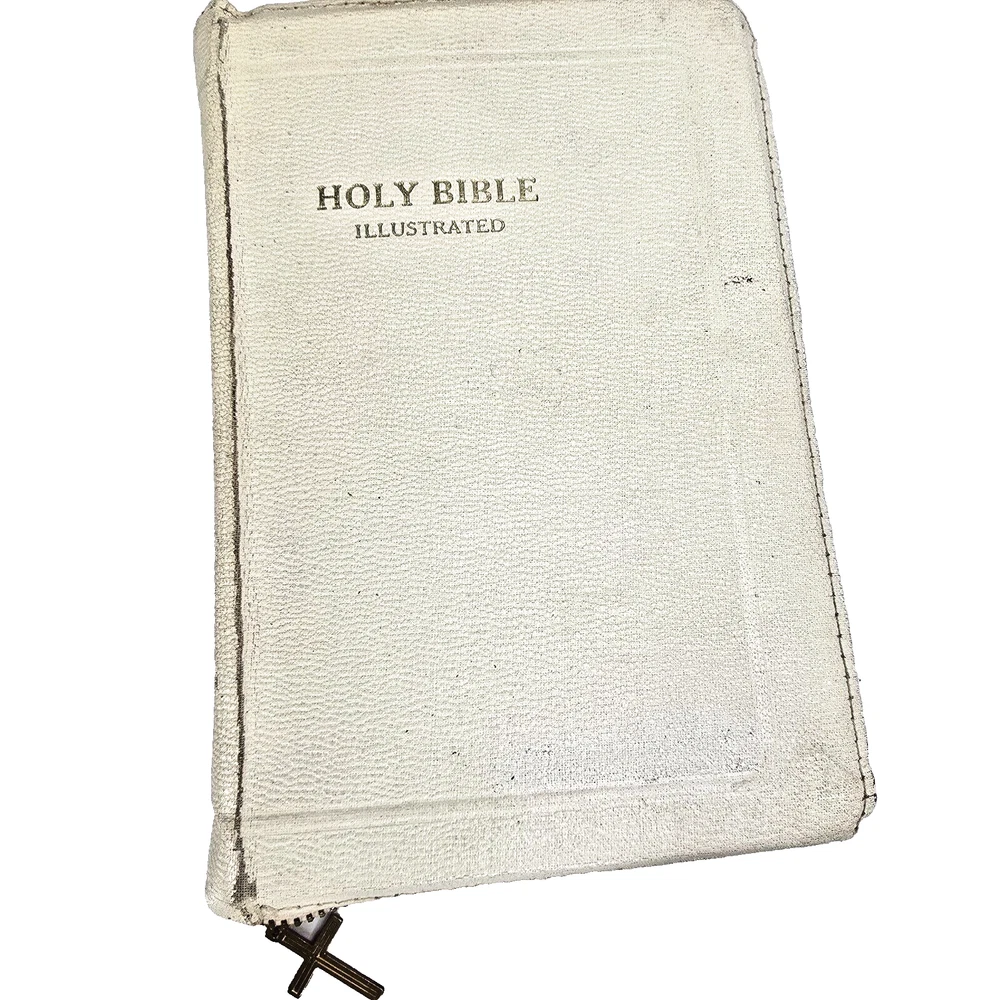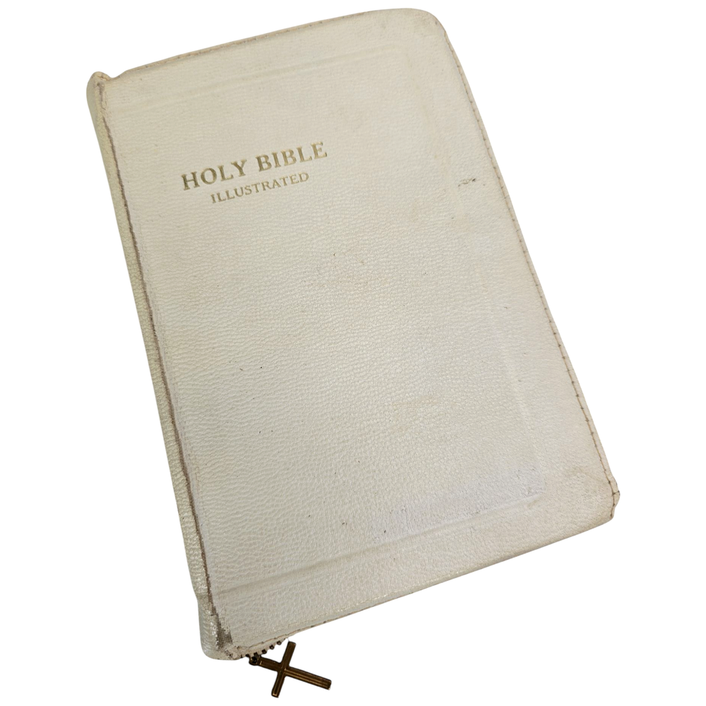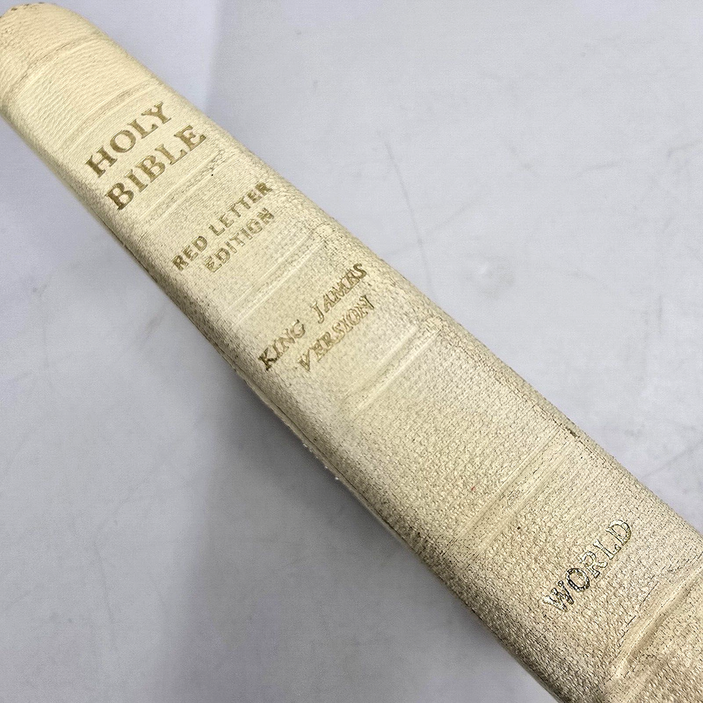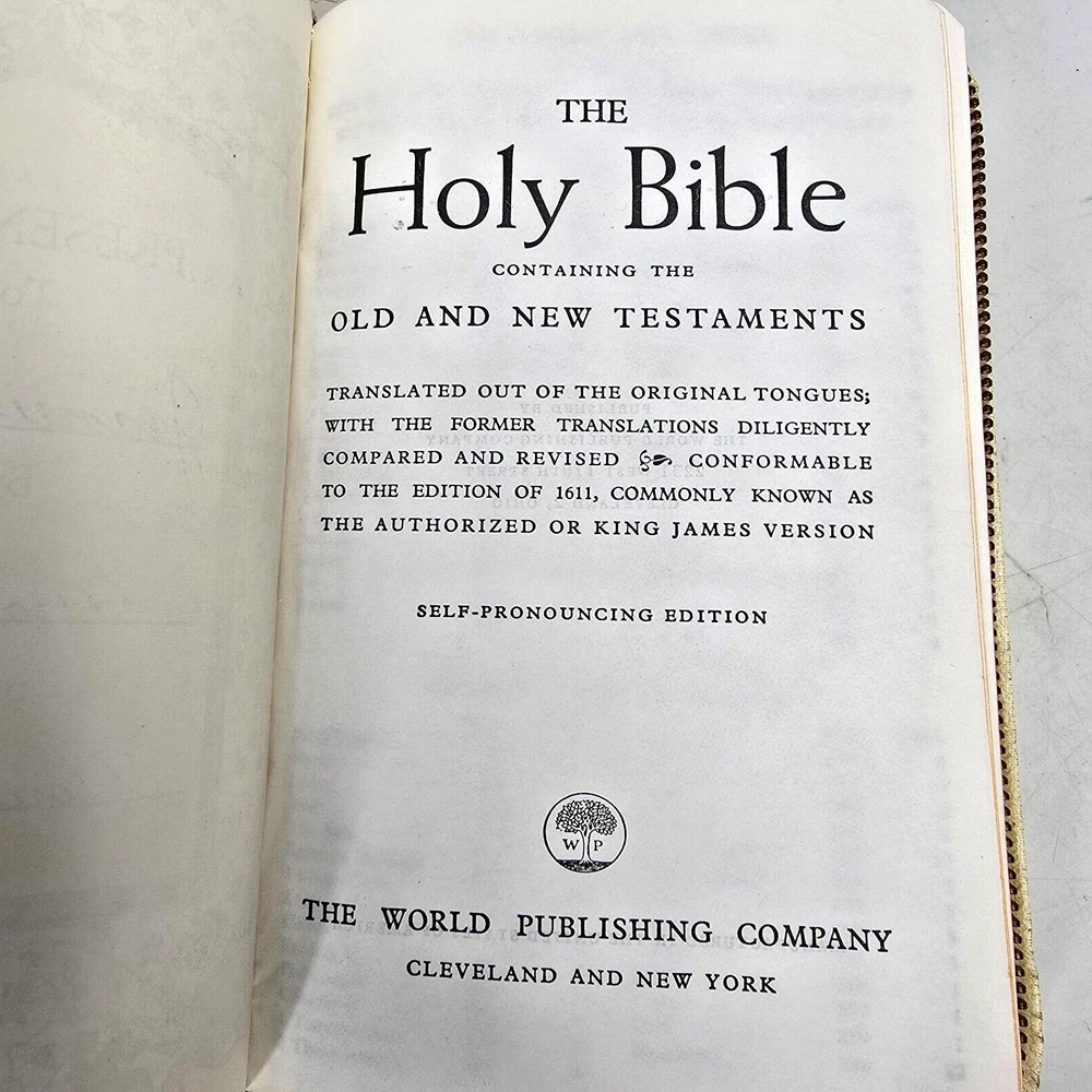 What a precious volume, one that we believe is the 1945 edition of the World Publishing Company's acclaimed illustrated King James Version Bible, not quite pocket sized, but small enough to be easily carried. The Words of Jesus are in red letters. The original white (now age-darkened a bit) zipper-open/close cover is complete and protects the still-white pages inside. We believe the previous owner kept this gem zippered closed when she was not reading it kept the interior so pristine. Includes several color painting illustrations from the Bible lands as well as being a self-pronouncing edition that Bible readers have come to appreciate so much over the years. Note: Please see the Seller's Notes about the condition above for all the details. Ships from a Pet-Free and Smoke-Free Home. Shipping Note: We refuse to profit from your shipping, and we will include multiple options so you can select the mailing method that works best for you and costs you the least. We refund any excess shipping costs you pay if you order more than one item and pay for all of them in one eBay cart. Note: We cannot combine outside-the-USA orders. Finally, we are not allowed to ship via UPS or FedEx to P.O. Boxes. Yes! We wrap extremely well and ship every single weekday (except the rare times when our listings disclose that we are away)!