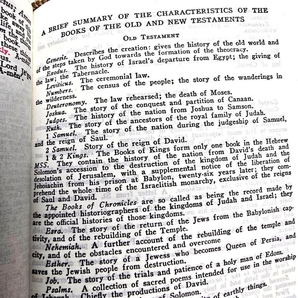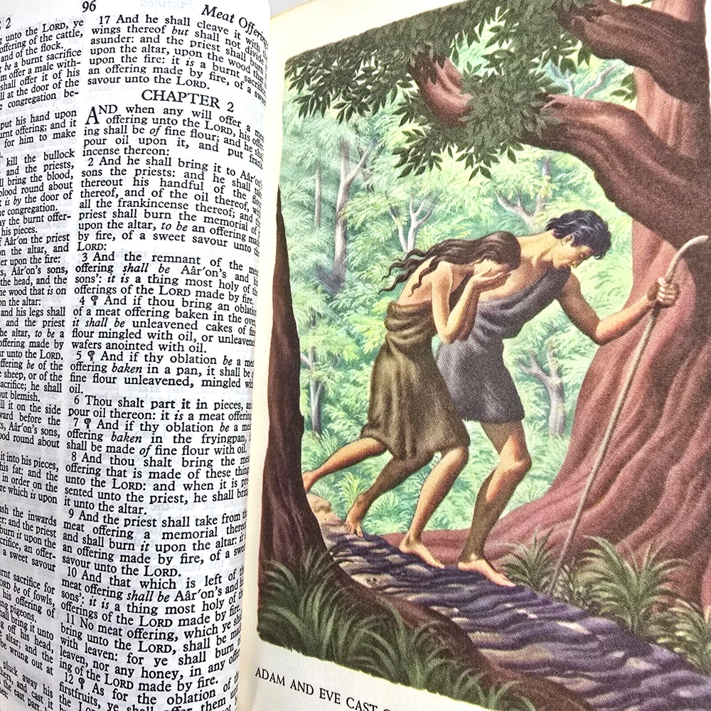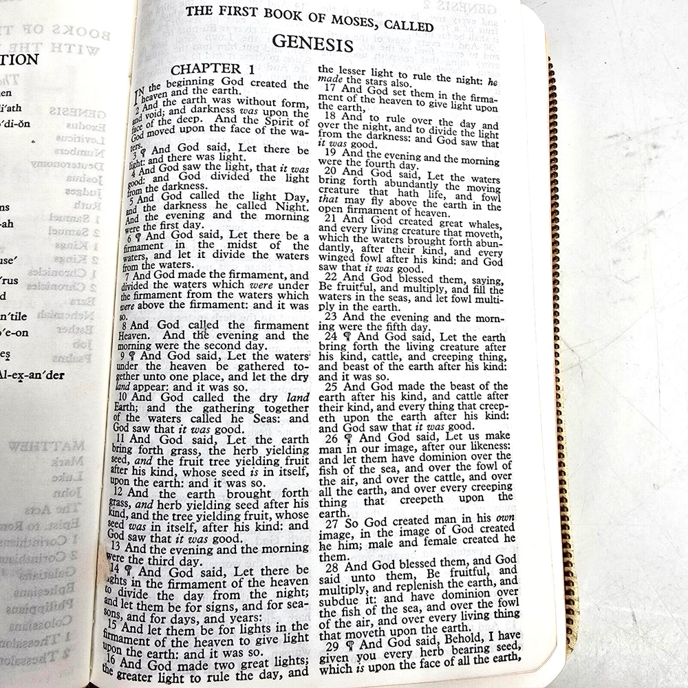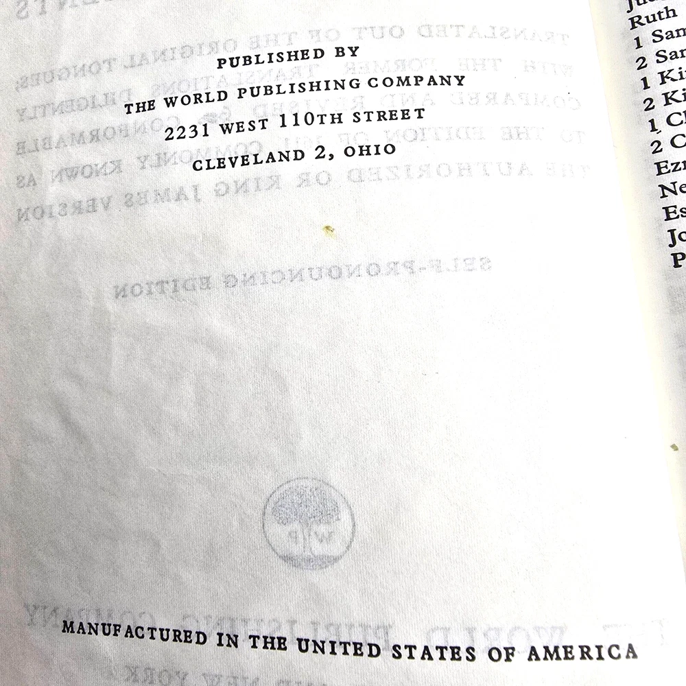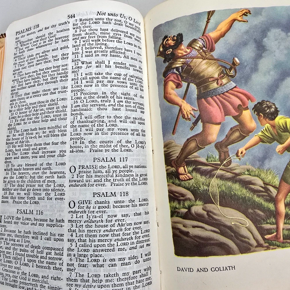 What a precious volume, one that we believe is the 1945 edition of the World Publishing Company's acclaimed illustrated King James Version Bible, not quite pocket sized, but small enough to be easily carried. The Words of Jesus are in red letters. The original white (now age-darkened a bit) zipper-open/close cover is complete and protects the still-white pages inside. We believe the previous owner kept this gem zippered closed when she was not reading it kept the interior so pristine. Includes several color painting illustrations from the Bible lands as well as being a self-pronouncing edition that Bible readers have come to appreciate so much over the years. Note: Please see the Seller's Notes about the condition above for all the details. Ships from a Pet-Free and Smoke-Free Home. Shipping Note: We refuse to profit from your shipping, and we will include multiple options so you can select the mailing method that works best for you and costs you the least. We refund any excess shipping costs you pay if you order more than one item and pay for all of them in one eBay cart. Note: We cannot combine outside-the-USA orders. Finally, we are not allowed to ship via UPS or FedEx to P.O. Boxes. Yes! We wrap extremely well and ship every single weekday (except the rare times when our listings disclose that we are away)!