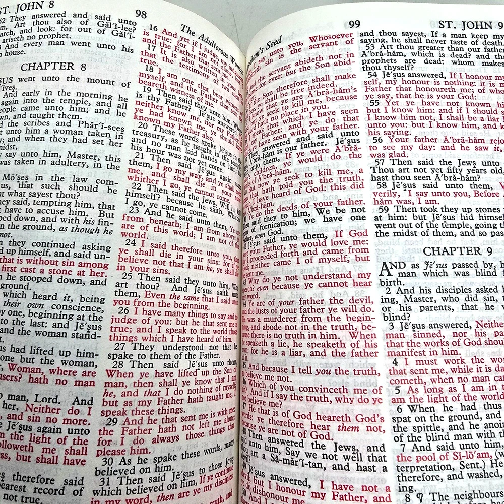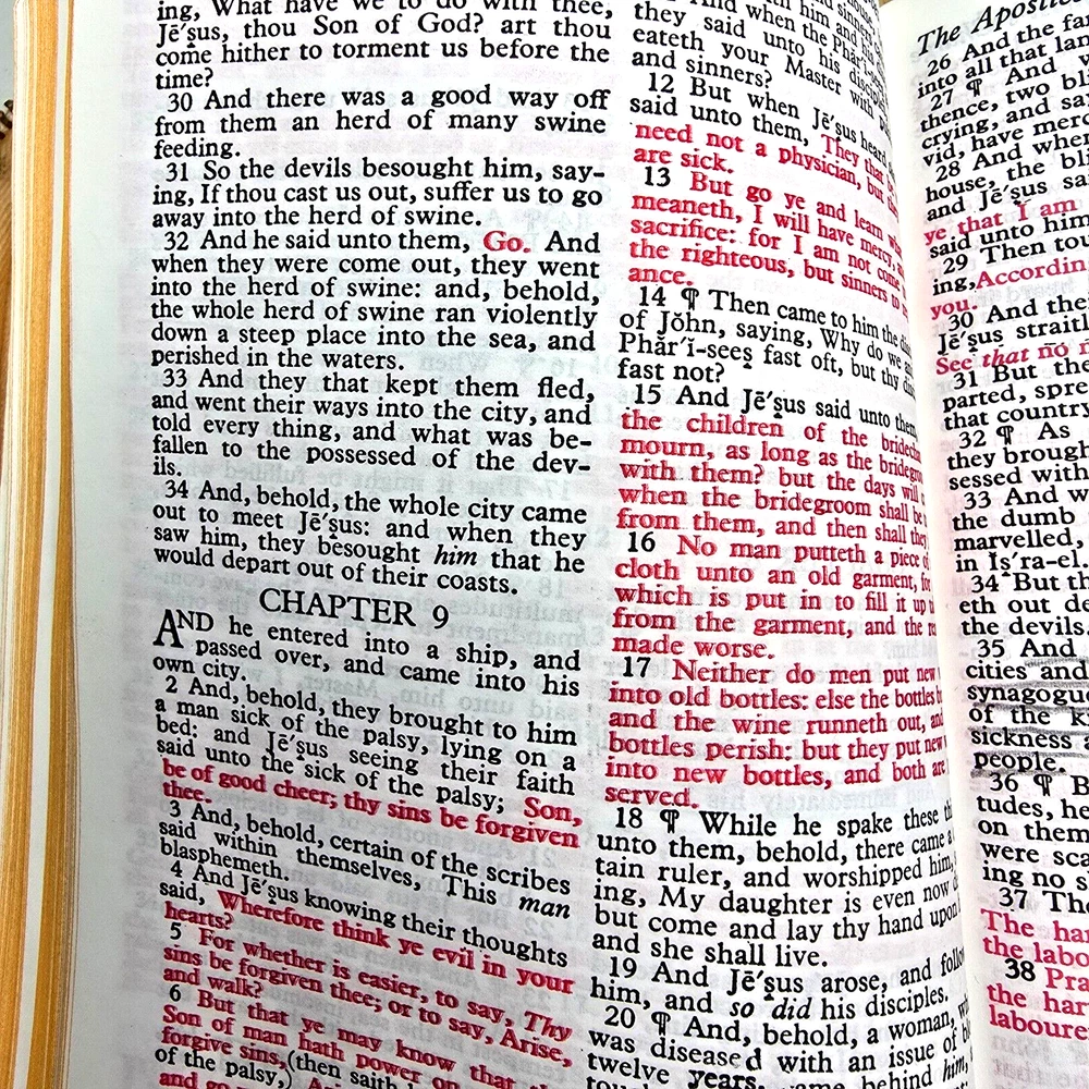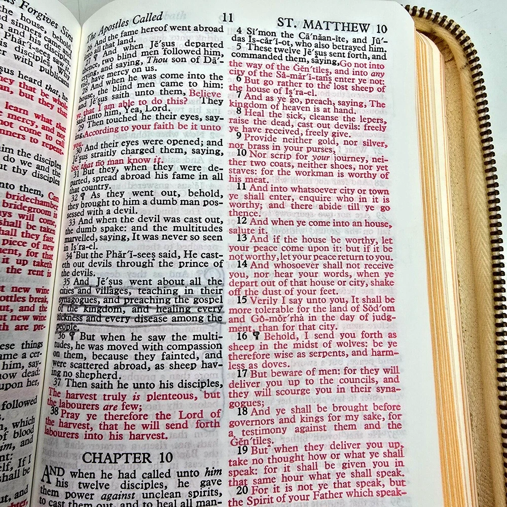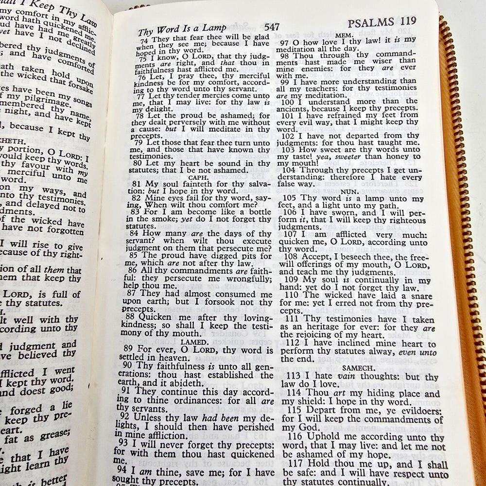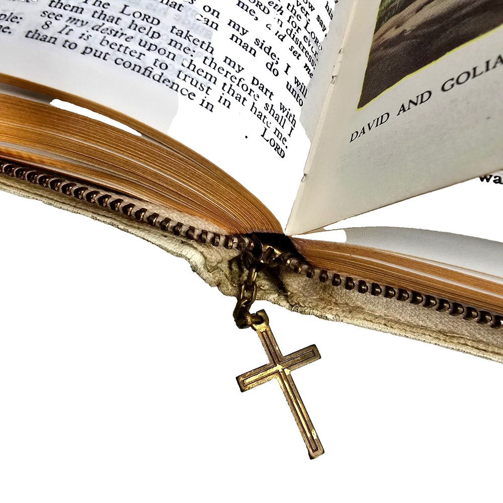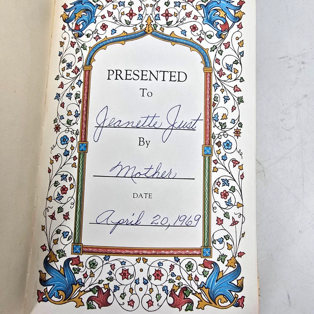 What a precious volume, one that we believe is the 1945 edition of the World Publishing Company's acclaimed illustrated King James Version Bible, not quite pocket sized, but small enough to be easily carried. The Words of Jesus are in red letters. The original white (now age-darkened a bit) zipper-open/close cover is complete and protects the still-white pages inside. We believe the previous owner kept this gem zippered closed when she was not reading it kept the interior so pristine. Includes several color painting illustrations from the Bible lands as well as being a self-pronouncing edition that Bible readers have come to appreciate so much over the years. Note: Please see the Seller's Notes about the condition above for all the details. Ships from a Pet-Free and Smoke-Free Home. Shipping Note: We refuse to profit from your shipping, and we will include multiple options so you can select the mailing method that works best for you and costs you the least. We refund any excess shipping costs you pay if you order more than one item and pay for all of them in one eBay cart. Note: We cannot combine outside-the-USA orders. Finally, we are not allowed to ship via UPS or FedEx to P.O. Boxes. Yes! We wrap extremely well and ship every single weekday (except the rare times when our listings disclose that we are away)!
