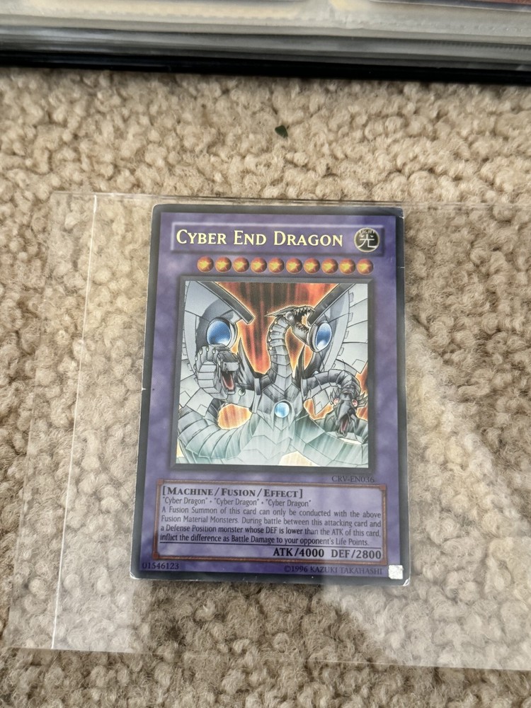 Misprint says Cyber Dragon 3 times on the card! This is the same rare CRV-EN036 with silver bottomr right vs gold, One is auctioning for a price well above my best bid i'll take it so enjoy! If I'm wrong offer me the real price Its not graded, but if you want more angles photos etc lmk Elevate your Yu-Gi-Oh! TCG collection with the iconic Cyber End Dragon, a prized piece from the Cybernetic Revolution set. This Ultimate Rare card, featuring the mesmerizing foil finish, showcases the Machine creature type in its full glory, with artwork that's a nod to the classic era of the game. Card number CRV-EN036 is a must-have for both seasoned collectors and new fans, capturing the essence of the game's rich history. This English-language card, manufactured by Konami in 2005, comes in Japanese card size and is suitable for ages 4 and up. It's not just a collectible but a centerpiece of nostalgia, featuring notable characters like Yami Yugi and Seto Kaiba. The card is made of quality card stock material and does not include an autograph. Cherish the legacy of Yu-Gi-Oh! with this timeless Cyber End Dragon card.