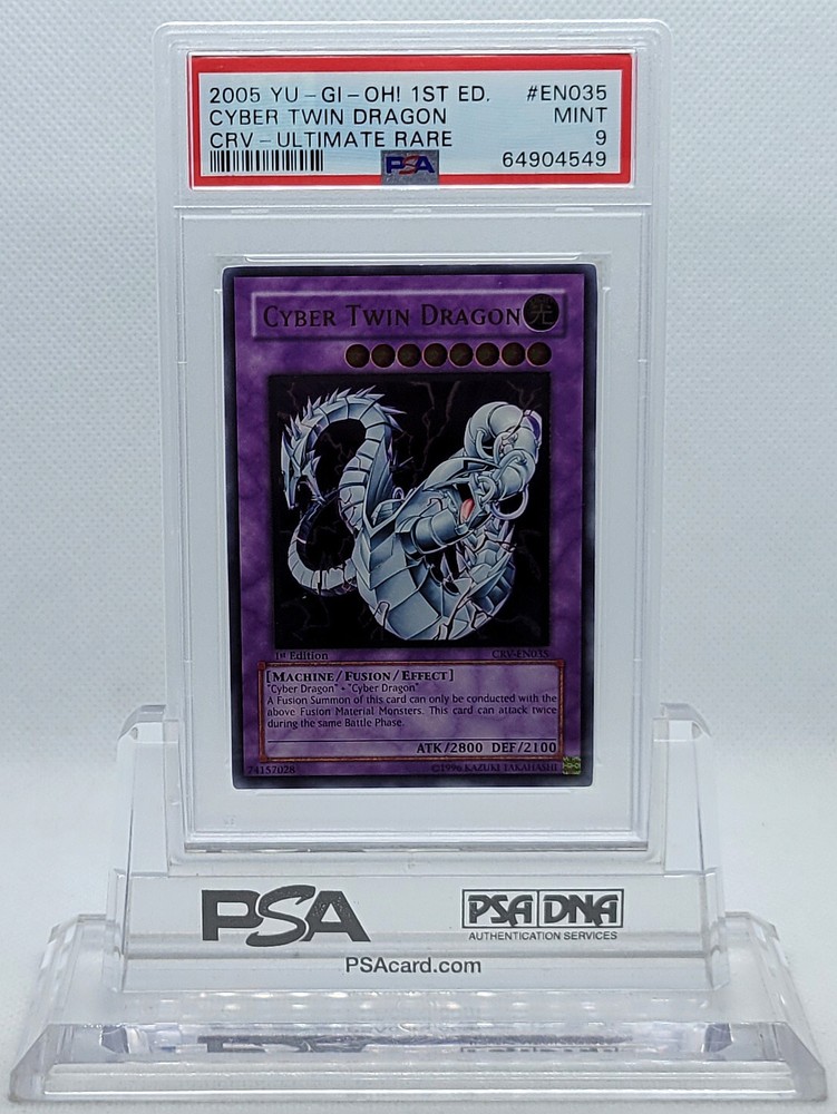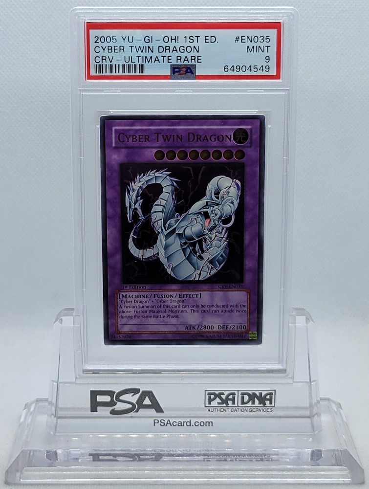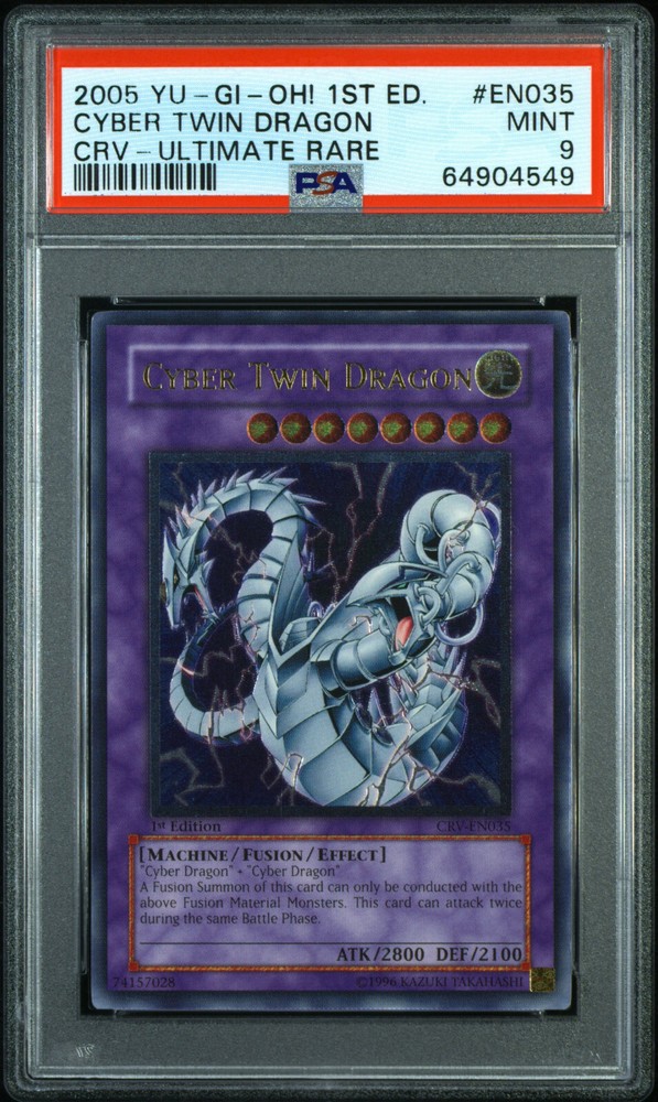 Description Condition: PSA 9 MINT Availability: In Stock You are Purchasing YUGIOH 1ST ED CRV-EN035 CYBER TWIN DRAGON ULTIMATE RARE PSA 9 MINT #64904549 Professionally graded by Professional Sports Authenticator (PSA) *PLEASE REVIEW PHOTO(S) BEFORE BIDDING/BUYING. >>MORE GRADED YUGIOH CARDS<< IG: CARD_RUSH_INC Payment Options Payment is expected within 7 days of your purchase date. We accept all forms of payments through Paypal. Shipping and Handling We ship to all U.S. states, U.S. territories, APO/FPO locations and any international countries listed under our "ship to" heading. Shipping and Handling is calculated based on the combined shipping weight of your item(s). Please use the shipping calculator to estimate your shipping and handling charges. In order to qualify for combined shipping terms, all items must be paid for in one payment; please do not pay until you are done bidding/shopping. Please contact us if you have any questions regarding our shipping and handling terms. Shipping and Delivery Packages are shipped out every Monday, Wednesday, and Friday. Domestic Packages take approximately 2-7 days to arrive. International packages may take a little longer to arrive, typically 1-4 weeks. Please allow ample transit times before inquiring about your package, thank you. Sales Tax Sales tax will be automatically collected by Ebay. Customer Service We will make every effort to get your purchase is mailed in a timely manner. Please contact us if you have any questions or concerns; we would love to hear any suggestions you have on how we can improve your eBay experience. Thank you for visiting us today.