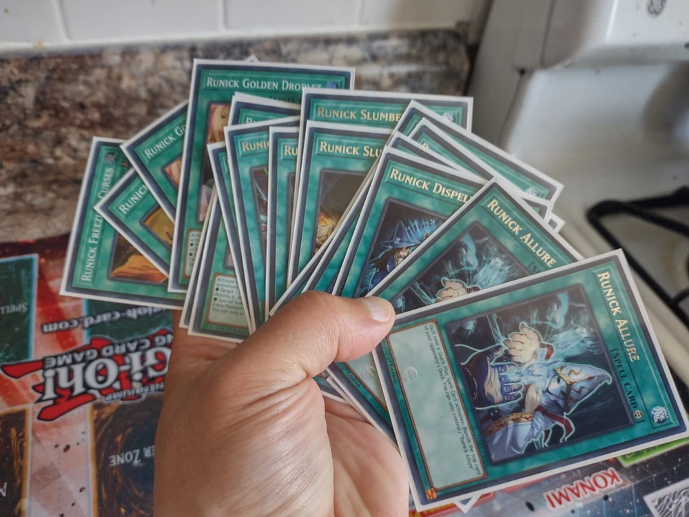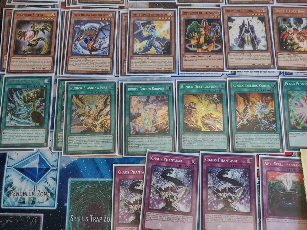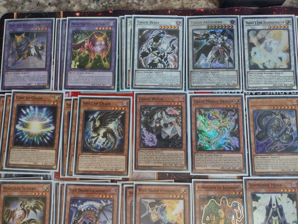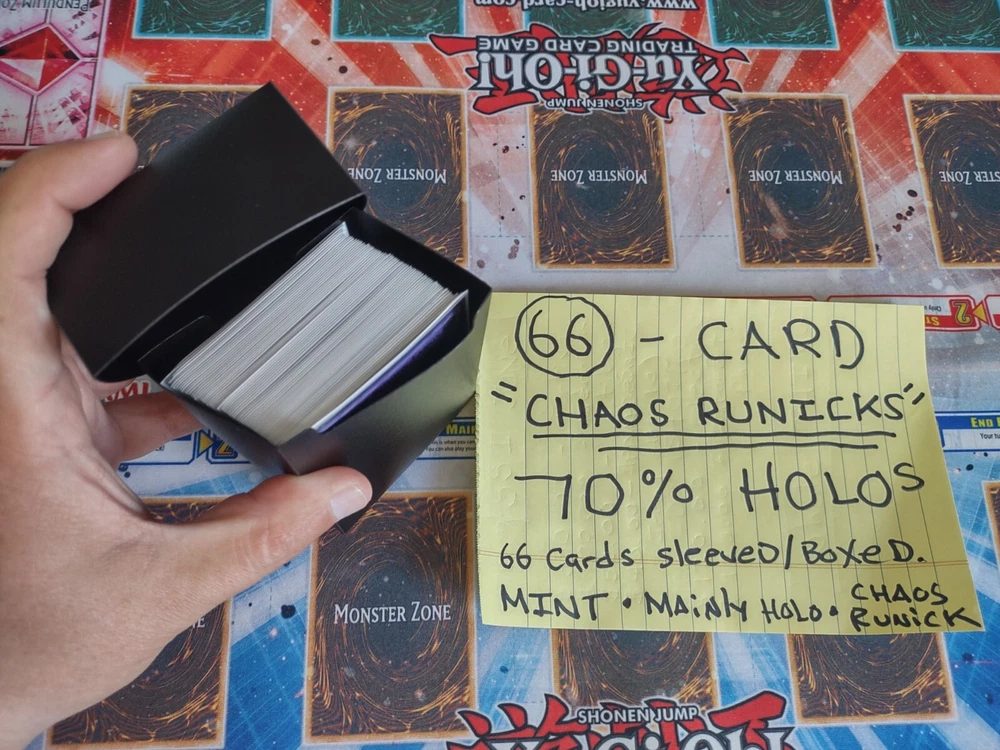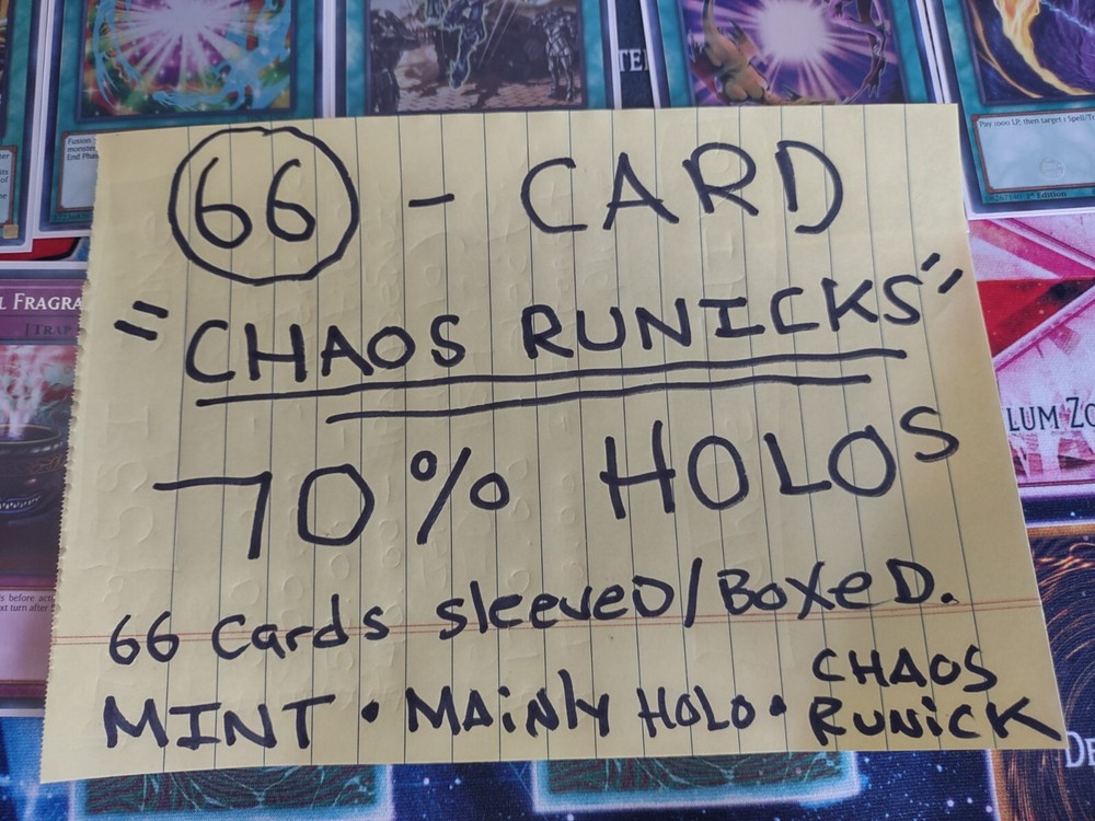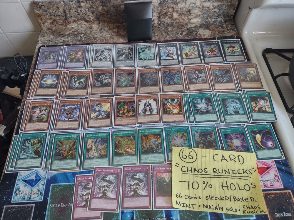 Auction is for a BRAND NEW, 100% MINT, 70% HOLOs (rares, supers, ultra, etc). Locals Ready CHAOS-RUNICKS DECK! 66 Cards! Boxed, w Extra Deck. Blinging! Chaos & Runicks! CONTENTS OF CHAOS & RUNICKS DECK (in order): 1x GERI THE RUNICK FANGS 3x FREKI THE RUNICK FANGS 3x CHAOS BEAST 1x CHAOS ARCHFIEND 1x NIGHT'S END ADMINISTRATOR 1x MAESTROKE THE SYMPHONY DJINN 1x MELOMELODY THE BRASS DJINN 1x MUZURHYTHM THE STRING DJINN 1x TEMTEMPO THE PERCUSSION DJINN 3x CORE OF CHAOS 3x SHELL OF CHAOS 1x CHAOS WITCH 1x CHAOS MIRAGE DRAGON 1x CHAOS DAEDALUS 1x CHAOS CREATOR 2x LILITH LADY OF LAMENT 2x MALICE LADY OF LAMENT 2x NIGHT'S END SORCERER 2x STARLIEGE SEYFERT 3x BLACK DRAGON COLLAPSERPENT 3x WHITE DRAGON WYVERNBUSTER 1x SUMMONER OF ILLUSIONS 1x SUMMONER MONK 1x DROLL & LOCK BIRD 3x RUNICK ALLURE 3x RUNICK DISSPELLING 3x RUNICK SLUMBER 3x RUNICK SMITING STORM 2x RUNICK FLASHING FIRE 2x RUNICK GOLDEN DROPLET 1x RUNICK DESTRUCTION 1x RUNICK FREEZING CURSES 1x FLASH FUSION 1x FUSION DEPLOYMENT 1x RE-FUSION 1x COSMIC CYCLONE 3x CHAOS PHANTASM 1x ANTI-SPELL FRAGRANCE ALL CARDS, LIGHT & DARK, WORK TOGETHER TO WIN GAMES. COMES WITH THE NECESSARY SPELLS AND TRAPS. THIS IS A PRO BUILD, LOCALS-READY. Best of its kind for price on web. Protective Shipping w. Tracking within 72 Hours from Post Office. International Sales (such as Canada or Europe) MUST USE the Ebay Global Shipping Program (also known now as Ebay International Shipping). No custom forms. No fed ex. No buts. Payment due right away via Buy it Now.