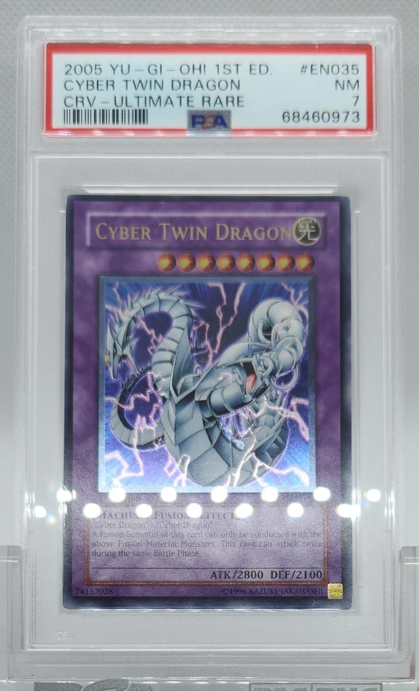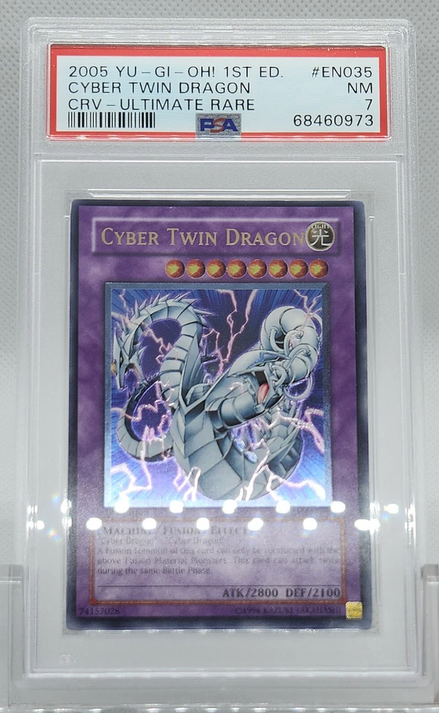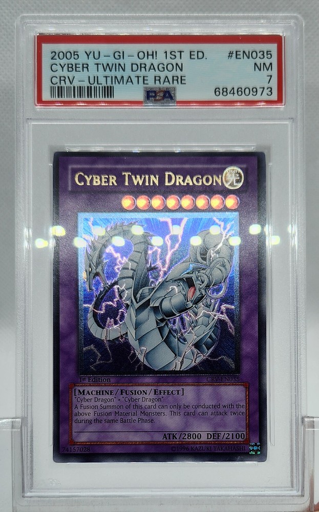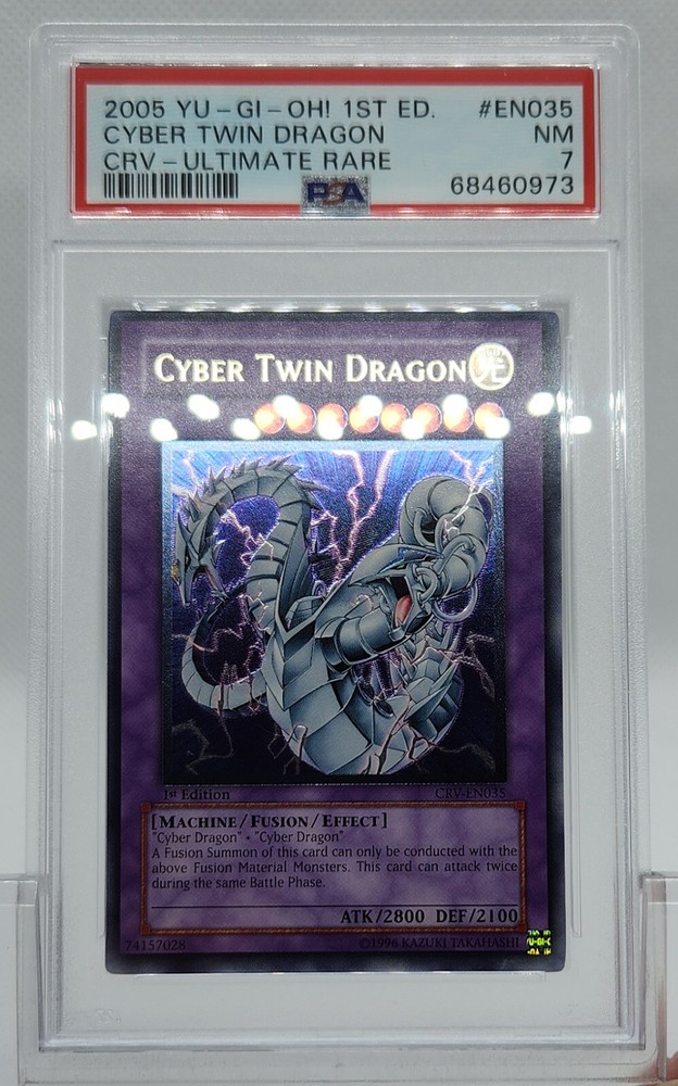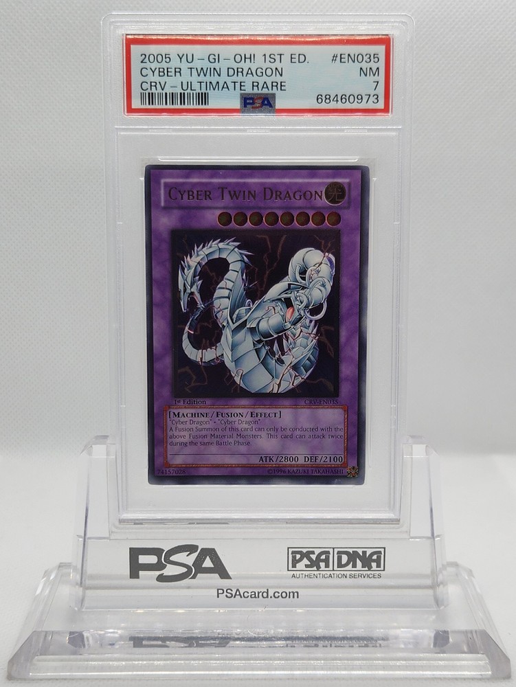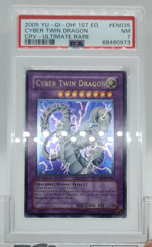 Description Condition: PSA 7 NM Availability: In Stock You are Purchasing YUGIOH CRV-EN035 CYBER TWIN DRAGON ULTIMATE RARE HOLO PSA 8 NEAR MINT #68460973 Professionally graded by Professional Sports Authenticator (PSA) *PLEASE REVIEW PHOTO(S) BEFORE BIDDING/BUYING. >>MORE GRADED YUGIOH CARDS<< IG: CARD_RUSH_INC Payment Options Payment is expected within 7 days of your purchase date. We accept all forms of payments through Paypal. Shipping and Handling We ship to all U.S. states, U.S. territories, APO/FPO locations and any international countries listed under our "ship to" heading. Shipping and Handling is calculated based on the combined shipping weight of your item(s). Please use the shipping calculator to estimate your shipping and handling charges. In order to qualify for combined shipping terms, all items must be paid for in one payment; please do not pay until you are done bidding/shopping. Please contact us if you have any questions regarding our shipping and handling terms. Shipping and Delivery Packages are shipped out every Monday, Wednesday, and Friday. Domestic Packages take approximately 2-7 days to arrive. International packages may take a little longer to arrive, typically 1-4 weeks. Please allow ample transit times before inquiring about your package, thank you. Sales Tax Sales tax will be automatically collected by Ebay. Customer Service We will make every effort to get your purchase is mailed in a timely manner. Please contact us if you have any questions or concerns; we would love to hear any suggestions you have on how we can improve your eBay experience. Thank you for visiting us today.