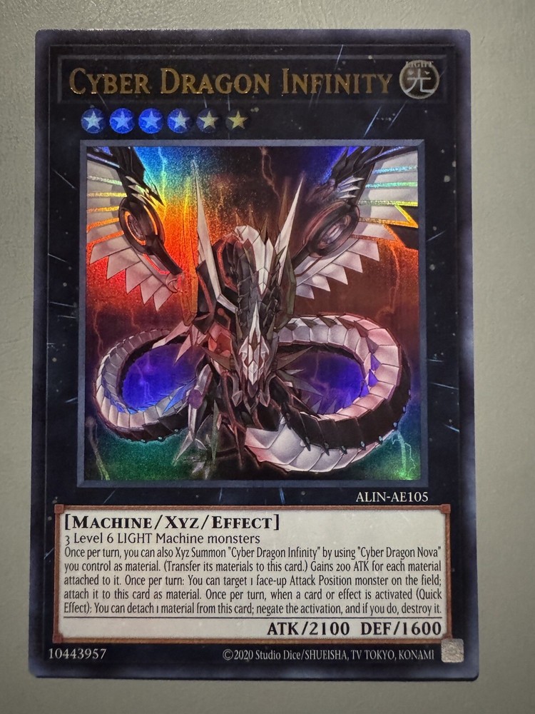 Card Name: Cyber Dragon Infinity Card Code: ALIN-AE105 Condition: New/Near Mint Shipping Details International Shipping (Registered with tracking number): US$10.00 Additional Items: US$0.50 for each item bought Note: 1. Shipping arrival times varies with locations.