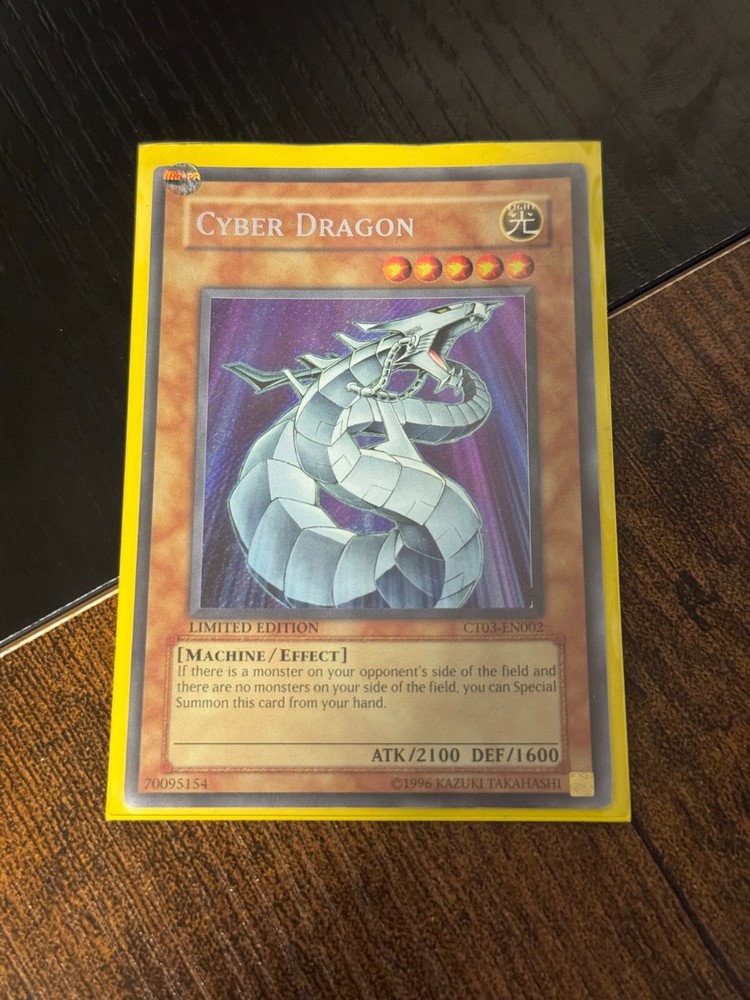 Experience the power of the Cyber Dragon with this limited edition card from the Yu-Gi-Oh! TCG. With a secret rare rarity and a holographic finish, this card is a must-have for any collector. The card features the iconic Cyber Dragon design and is numbered CT03-EN002. This card is perfect for those looking to add a unique and rare card to their collection. It is an effect type card and is manufactured by Konami. Don't miss out on the chance to own this amazing card!