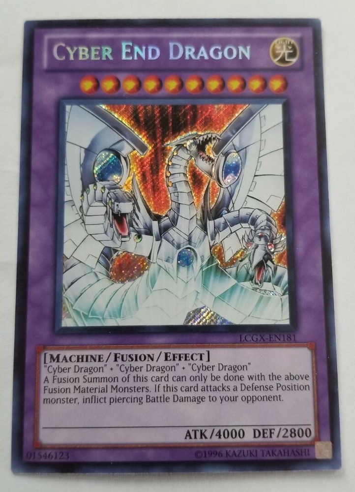 Welcome fellow collectors and players! How you all doing? Welcome to our humble store!!! This offer here is for: A SECRET RARE CYBER END DRAGON! A highly collectible card but Please look carefully at the pictures before buying, Make sure this is the one for you!!! All of our items are carefully packed. You know, we will pack it the same way we will love to receive them...Safely! All of our Trading card items comes with extra cards including a free random holo. This is as a token of our gratitude!!! We ship fast! Either the same day or the next! ( weather permitting of course) *All purchases totalling $20 or more will be bumped to tracked shipping, bubbled envelopes and more free cards!!! All cuestions are always welcome! And in the strange case that something didn't go right with your order, please give us the chance to make it right!!!! One more thing: " I draw for turn, summon Goblin attack force, set one, pass..." 😁😂 Cyber End Dragon - LCGX-EN181 - Secret Rare - Unlimited Edition - Near Mint. Condition is "Used". Shipped with USPS First Class.