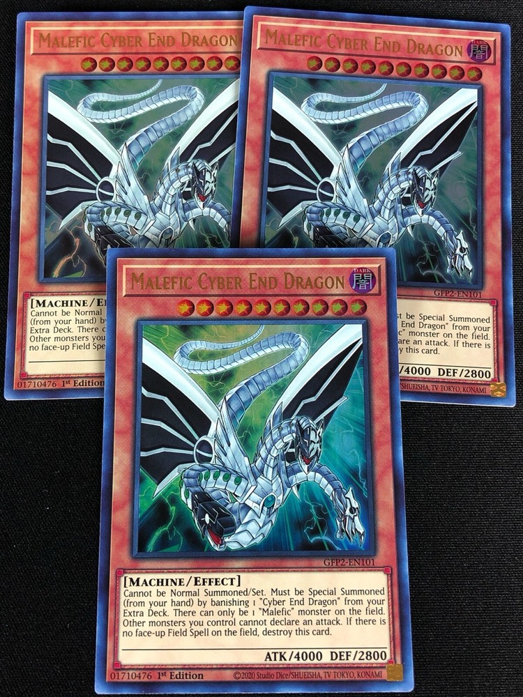 YUGIOH MALEFIC CYBER END DRAGON GFP2-EN101 1ST ULTRA X3 ALL CARDS IN THIS AUCTION ARE IN NEAR MINT TO MINT CONDITION UNLESS STATED OTHERWISE IN THE TITLE. AND, YOU ARE GUARANTEED TO RECEIVE THE CARD NAMED IN THE TITLE. PLEASE NOTE, IF THERE'S MORE THAN 1 COPY AVAILABLE, YOU MAY NOT RECIEVE THE SAME EXACT CARD IN THE PHOTO. HOWEVER, IT WILL BE THE SAME EXACT CARD IN THE TITLE, AND DESCRIPTION! PLEASE CONTACT ME IF THERE IS ANYTHING WRONG WITH YOUR ORDER OR SHIPPING BEFORE LEAVING FEEDBACK. PLEASE GIVE ME A CHANCE TO FIX ANY PROBLEM YOU MAY HAVE. THANK YOU! Shipping Information: Shipping and Handling for this auction will be Free inside the United States - With Tracking! International Shipping Available Through Ebay’s Global Shipping Program. (BUYER IS RESPONSIBLE FOR ANY TAX) **Read the TITLE to see the condition of the cards Before you place a bid. Any damaged cards will be listed as such In The Title (FOR EXAMPLE: Blue Eyes White Dragon LOB-001 (HP) If it doesn't say anything about damage, it is in near-mint to mint condition. If you have any questions, message me Before you place your bid.** *PLEASE READ* Ebay's Card Condition Guidelines: (NM) = Near mint or better Comparable to a fresh pack Flaws may include Minor corner and edge wear (LP) = Lightly played (Excellent) Has clearly visible signs of wear Flaws may include Moderate edge chipping Moderate surface scuffing Fuzzy corners (MP) = Moderately played (Very good) Has moderate-to-heavy damage all over Flaws may include Moderate discoloration Moderate creasing Moderate to heavy edge chipping Rounding and soft corner (HP) = Heavily played (Poor) Is extremely worn and displays flaws all over Heavily Played condition cards exhibit signs of heavy wear. Heavily Played condition cards may include cards that have significant creasing, folding, severe water damage, heavy whitening, heavy border wear, and/or tearing. RETURN POLICY: RETURNS ARE ACCEPTED IF THE ITEM ARRIVES DAMAGED, OR NOT AS DESCRIBED. RETURNS ARE NOT ACCEPTED FOR BUYERS REMORSE. CHECK OUT MY OTHER AUCTIONS! _gsrx_vers_1680 (GS 9.8.3 (1680))