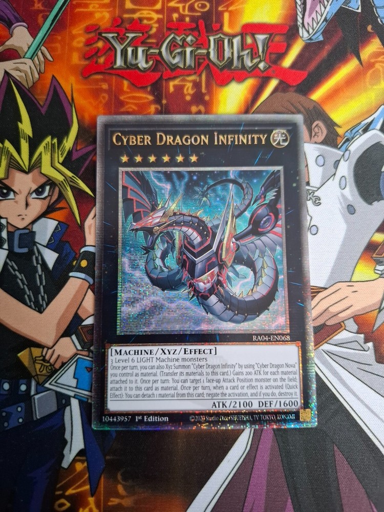 The YU-GI-OH Quarter Century Secret Rare card, Cyber Dragon Infinity, from the Quarter Century Stampede set, is a Colourless Machine-type Xyz card made of card stock by manufacturer Konami. This English language card, with the card number RA04-EN068, features 1st Edition printing and is suitable for players aged 6 and above in the Yu-Gi-Oh! TCG game. With its rarity as a Secret Rare, this iconic card is a valuable addition to any Yu-Gi-Oh! card collection.