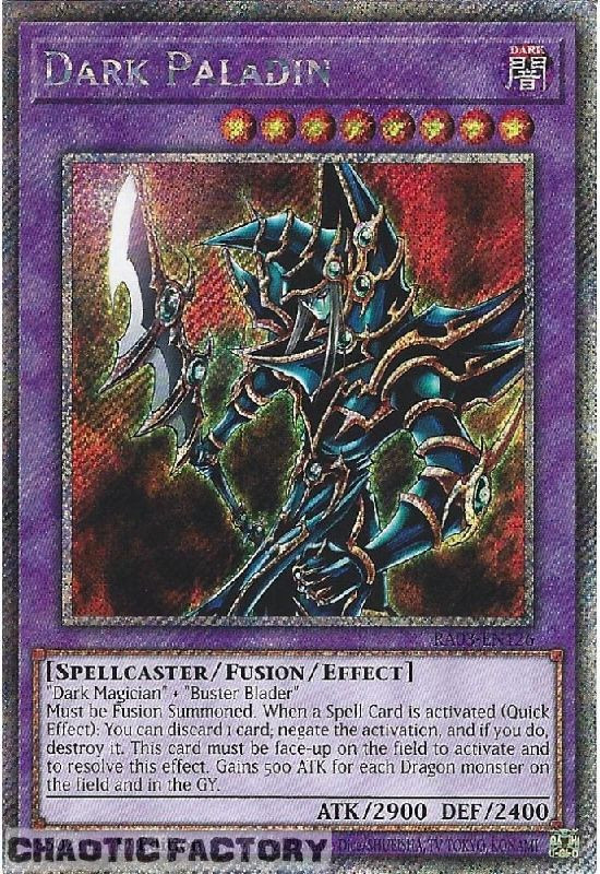RA03-EN126 Dark Paladin Platinum Secret Rare 1st Edition NM PREORDER, PROCESS AFTER 08/11/2024' YU-GI-Oh! Product details (click to expand) Condtion Details NM Mint or Near mint LP Light Played, minor scatch or edge wear HP Heavy Played; very visible damages NOTE Refer to ebay's condition guide for further details Specifications (click to expand) SKU RA03-EN126 Model # Barcode # Brand YU-GI-Oh! Artist / Author Shipping Weight 0.0200kg Shipping Width 0.000m Shipping Height 0.000m Shipping Length 0.000m Shipping Cubic 0.000000000m3 Unit Of Measure ea Assembled Length 0.000m Assembled Height 0.000m Assembled Width 0.000m Type Format Delivery & Turn Around time (click to expand) Packing We always pack with toploader & soft sleeves Postage Method - Doemstic Standard Untracked Untrack letter post, delivery within 15 business days Domestic Tracked Tracked letter post, delivery within 15 business days with tracking Express Post Express Post; delivery after 2 to 3 business days after dispatch using AUSPOST's express network, exclusion applies; check auspost's website for details Turn Around time Dispatch 2 to 3 business days; which mean EXCLUDE WEEKEND © 2025 Chaotic Factory