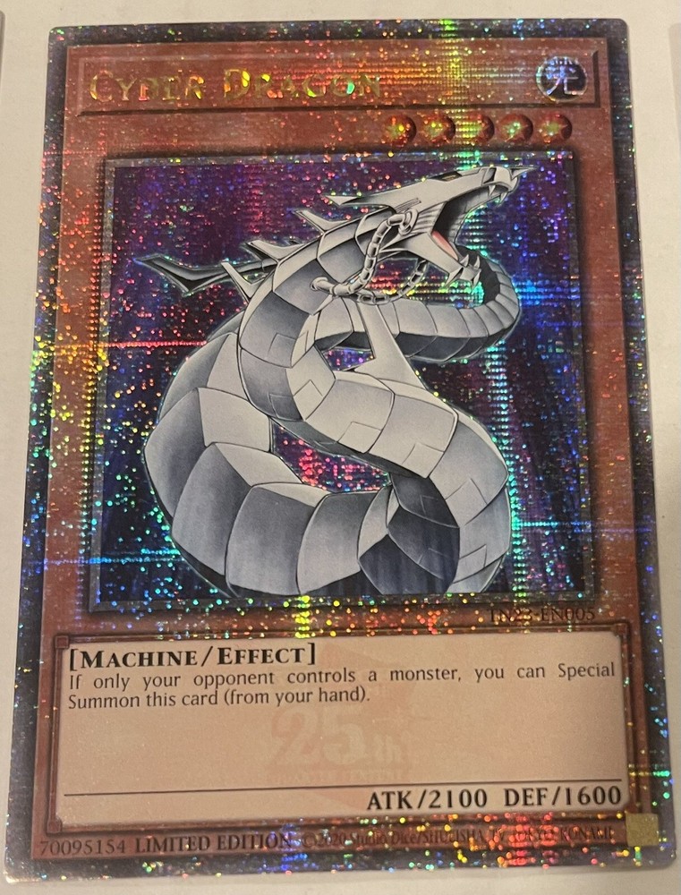 You are bidding on: 1x YUGIOH TN23-EN005 Cyber Dragon Quarter Century Secret Rare Card Limited Edition Any questions please don’t hesitate to ask. Photos are of the card you will receive but it may not be the exact card due to quantity of each item. Thanks for looking please check my other auctions out. Happy buying. Returns will not be accepted if the item you purchased has changed in value since purchase due to reprint announcement, or if the card is returned is worse condition that originally sent in.