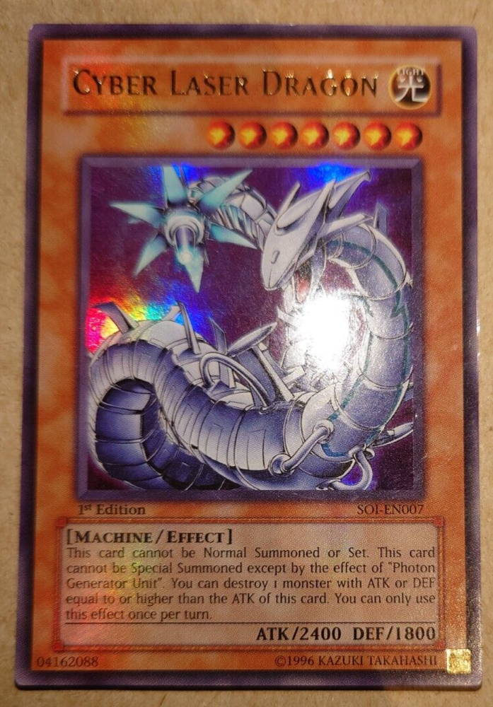 This YUGIOH Ultra Rare Cyber Laser Dragon SOI-EN007 is a highly sought-after collectable card. It features the Cyber Laser Dragon character and is a 1st Edition card. The card is written in English and is perfect for collectors and fans of the Yu-Gi-Oh! TCG game. The rarity of this card makes it a valuable addition to any collection. It is part of the CCG Individual Cards and Collectable Card Games categories, and is a must-have for fans of the collectables. Don't miss out on the chance to own this ultra-rare card!
