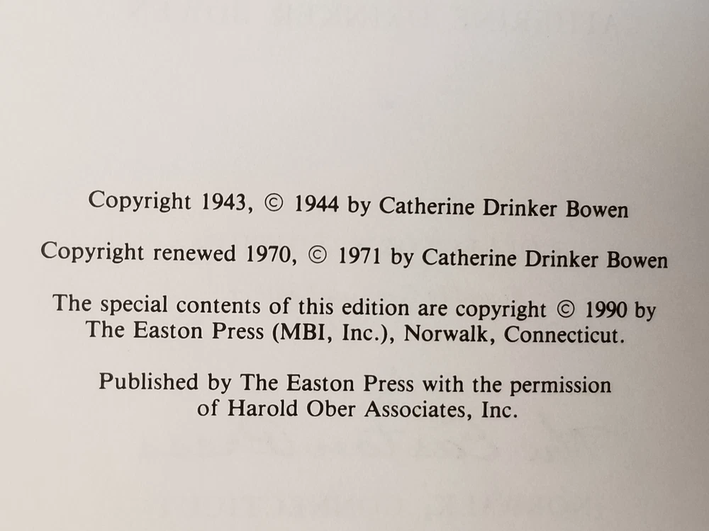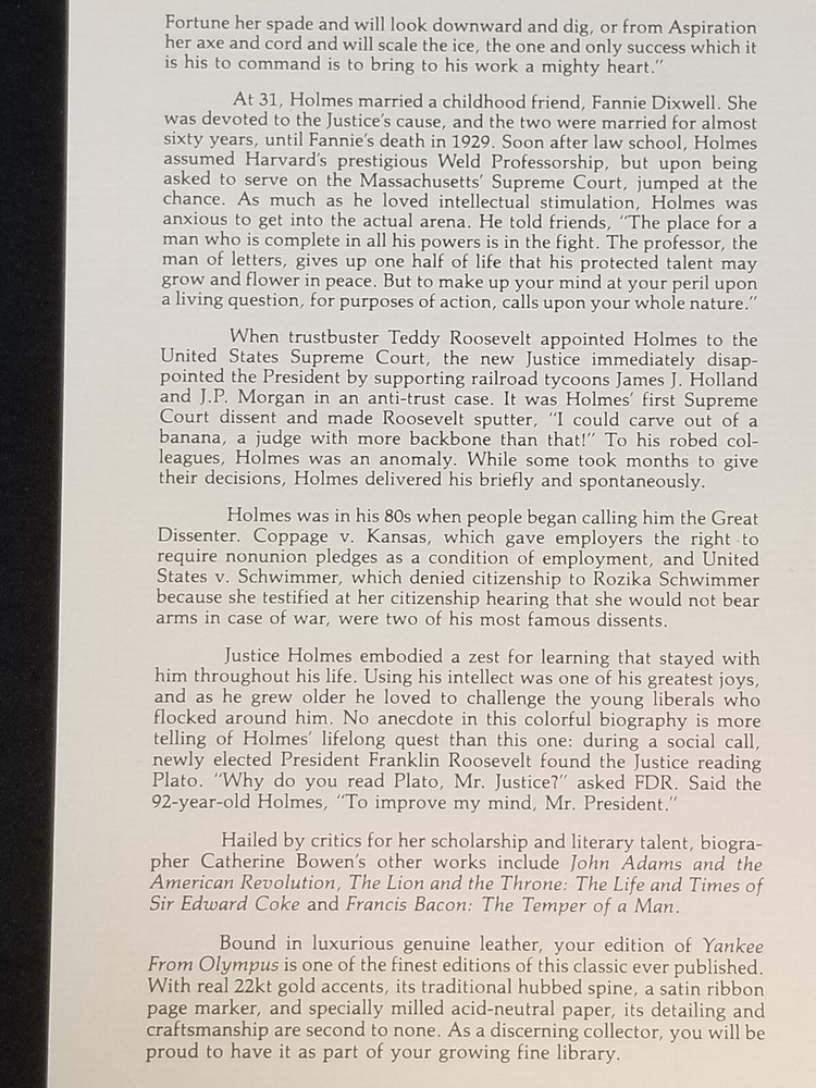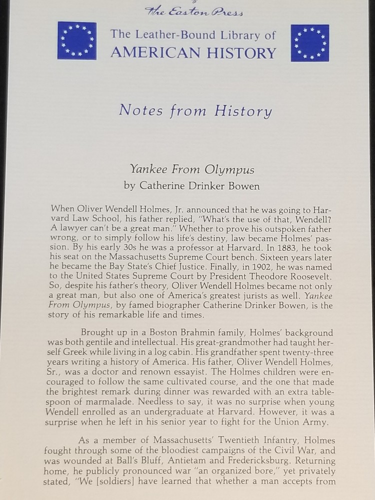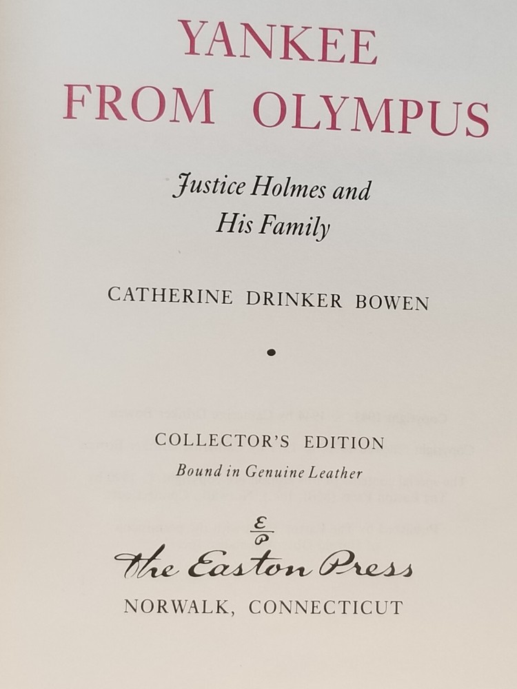 Yankee from Olympus: Justice Holmes and His Family , Catherine Drinker Bowen. Easton Press © 1944/1990, 475 pages, 6.5 x 9.5 x inches; 2 lbs., 10 oz. [42] CONDITION : The book is in very good overall condition; printed on archival quality, acid-neutral paper; bound in genuine leather; and accented with 22kt gold. The top right corner of the spine shows signs of wear (see photos0. The pages are gilt edged, unmarked, and clean cut. The books have been in a smoke free house for the past 5 years, but we do have cats. Please examine the photos carefully as they are a part of the description of the condition. CONTENTS : See photo of Contents , and the photos of the insert for more details. AUTHOR : According to Wikipedia, “Catherine Drinker Bowen (January 1, 1897 – November 1, 1973) was an American writer best known for her biographies… Bowen was born Catherine Drinker on the Haverford College campus in Haverford, Pennsylvania, on January 1, 1897, to a prominent Quaker family. She was an accomplished violinist who studied for a musical career at the Peabody Institute and the Juilliard School of Music, but ultimately decided to become a writer. She had no formal writing education and no academic career, but became a bestselling American biographer and writer despite criticism from academics. Her earliest biographies were about musicians. Bowen did all her own research, without hiring research assistants, and sometimes took the controversial step of interviewing subjects without taking notes… During her lifetime, she was the recipient of numerous awards... In 1962, she became the first woman to receive an honorary degree from Lehigh University… At the time of Bowen's death in 1973, she was working on a biography of Benjamin Franklin…” ILLUSTRATIONS : See the list of Illustrations in the photos.