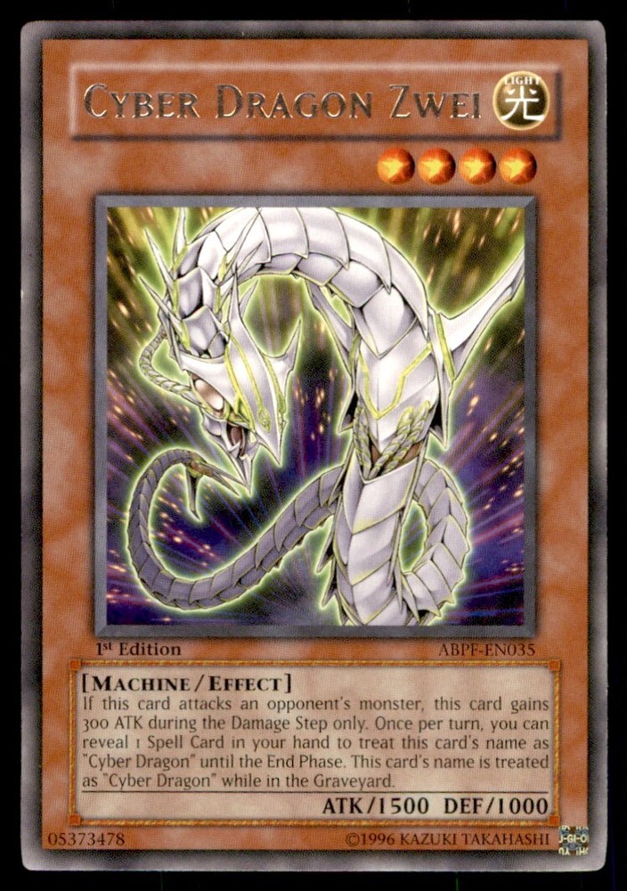 About Me Other Listings Feedback Add to Favorites Contact Me Bluenose Yu-Gi-Oh! 1st Edition Cyber Dragon Zwei #ABPF-EN035 Light Play No stock photo / These are real scans or pictures Details Description: Cyber Dragon Zwei Category: Yugioh Year: 1996 Product: Yu-Gi-Oh! Set: 1st Edition Card Number: ABPF-EN035 Special: Light Play Dimensions: 3¼" x 2¼" SKU: YU B0003 R04 T (7) Payment Payment for buy it now is required immediately and for auctions it must be paid within 72 hours. Shipping Shipments usually make their way out in 3 business days. All orders to USA under 800$ USD typically are NOT subject to import or duty! We also offer free shipping on all our cards for north america. Returns and Claims Please view listing photo and description prior to purchase of card to make sure the card and condition is right for you! About Us Please keep in mind the following conditions .-------------------------------------------Near Mint: a card that shows very little to no signs of ware or usage such as very little whiting. -------------------------------------------Light Play: A card that shows signs of ware such as but not limited to whiting, slight bend or scratches. -------------------------------------------Heavy Play: A card that shows signs of ware, whiting, bending, creasing, folding or other various issues.-------------------------------------------Damaged: a card in very bad condition can have some or all of the above mentioned condition notes including peeling, stains, writing, etc.-------------------------------------------The photo in ads are the EXACT card you will recieve. Listing By Kronocard trading cards software v2.7.0.1