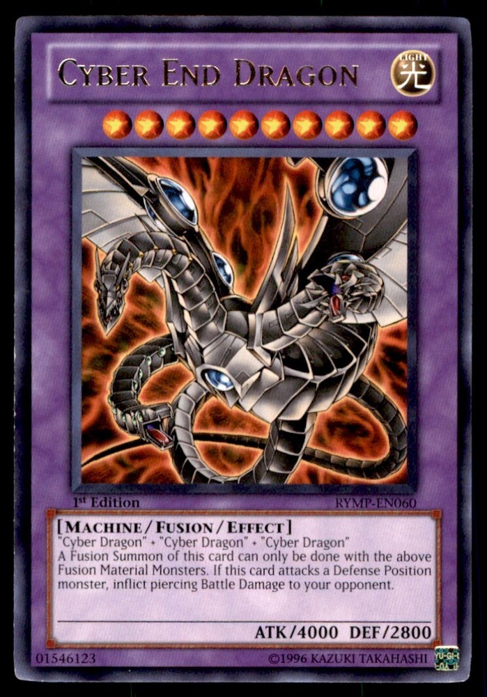 About Me Other Listings Feedback Add to Favorites Contact Me Bluenose Yu-Gi-Oh! 1st Edition Cyber End Dragon #RYMP-EN060 Light Play No stock photo / These are real scans or pictures Details Description: Cyber End Dragon Category: Yugioh Year: 1996 Product: Yu-Gi-Oh! Set: 1st Edition Card Number: RYMP-EN060 Special: Light Play Dimensions: 3¼" x 2¼" SKU: YU B0003 R03 L (15) Payment Payment for buy it now is required immediately and for auctions it must be paid within 72 hours. Shipping Shipments usually make their way out in 3 business days. All orders to USA under 800$ USD typically are NOT subject to import or duty! We also offer free shipping on all our cards for north america. Returns and Claims Please view listing photo and description prior to purchase of card to make sure the card and condition is right for you! About Us Please keep in mind the following conditions .-------------------------------------------Near Mint: a card that shows very little to no signs of ware or usage such as very little whiting. -------------------------------------------Light Play: A card that shows signs of ware such as but not limited to whiting, slight bend or scratches. -------------------------------------------Heavy Play: A card that shows signs of ware, whiting, bending, creasing, folding or other various issues.-------------------------------------------Damaged: a card in very bad condition can have some or all of the above mentioned condition notes including peeling, stains, writing, etc.-------------------------------------------The photo in ads are the EXACT card you will recieve. Listing By Kronocard trading cards software v2.7.0.1
