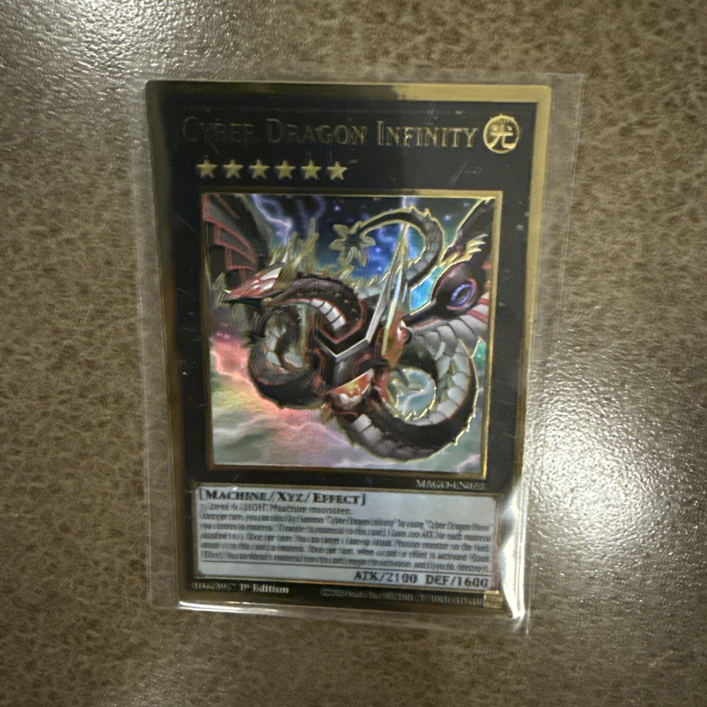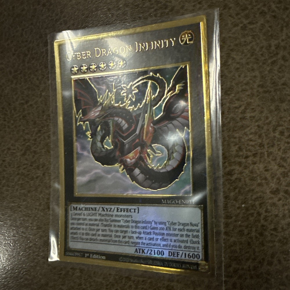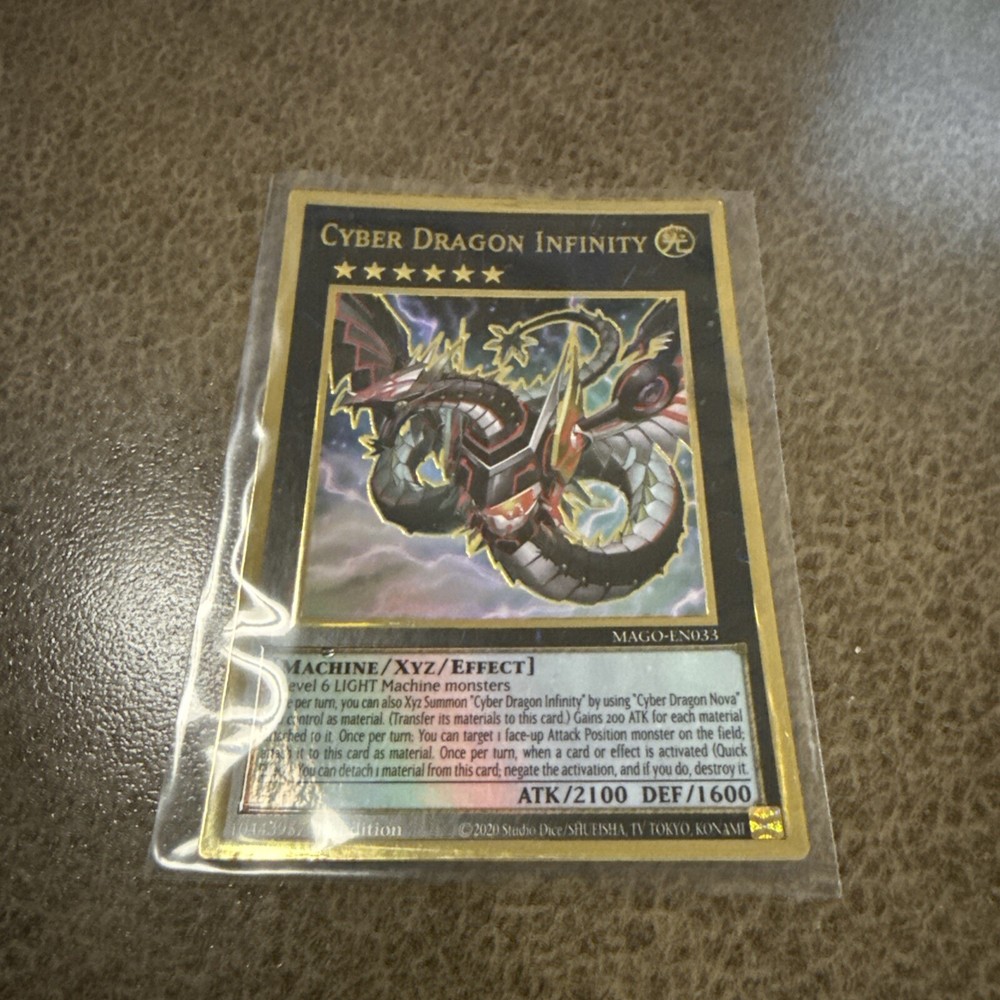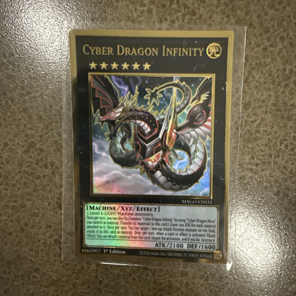 The product is a Yu-Gi-Oh! TCG card Cyber Dragon Infinity, with alternative artwork. Maximum Gold Rate with gold writing, embossed artwork, foil, and alternative artwork design. Manufactured by Konami in 2020, this card is identified by the code MAGO-EN033 and is a 1st Edition release.