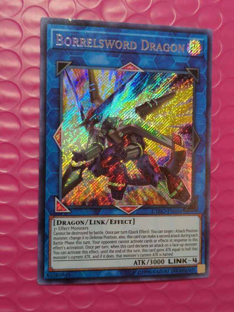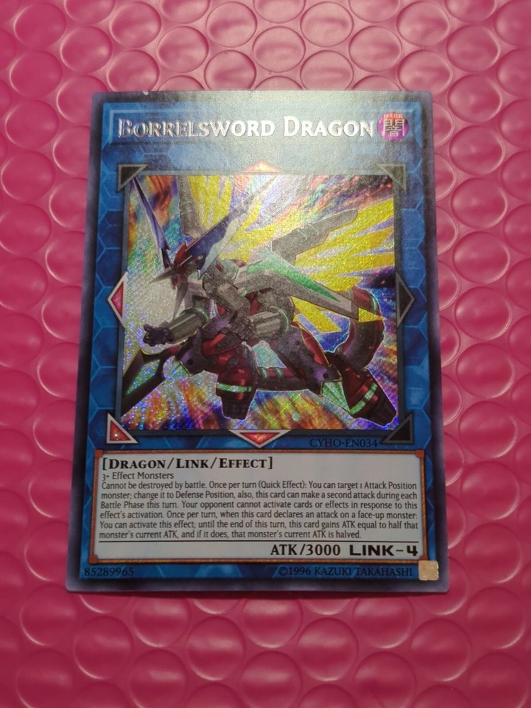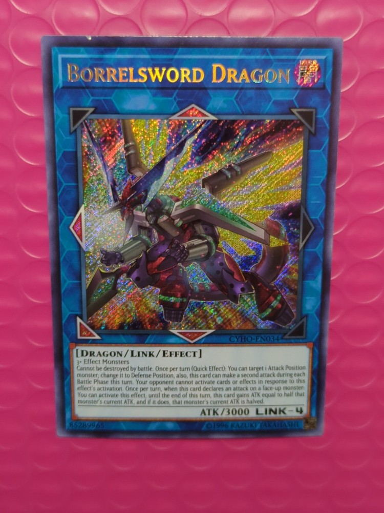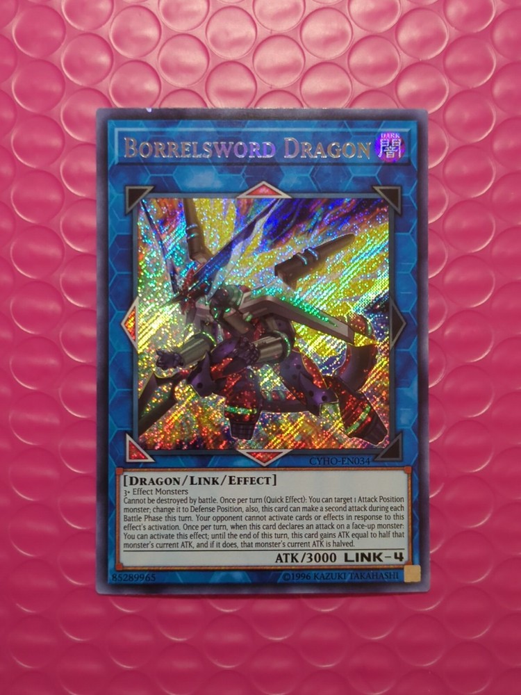 Yu-Gi-Oh! Borrelsword Dragon CYHO-EN034 Secret Rare Unlimited NM. The condition of this card is: Near Mint *All cards sold will be inside of a penny sleeve and top load card holder. Packaging will be in a bubble envelope for extra protection.* **In an attempt to empty my collection, every order will come with a gift of additional sleeved cards of various conditions that may fit the theme/archetype (depending on what's remaining in my collection). The bigger the sale, the bigger the gift!**