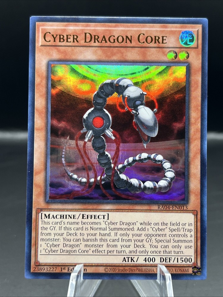 You are buying : “ YuGiOh – CYBER DRAGON CORE ULTRA RARE 1st Edition RA04-EN0413 " Card Condition: NM - See pictures for exact condition Card will be shipped within one business day of received payment and sent within a penny sleeve, top loader and team bag while protected with card board and shipped securely within a bubble mailer to ensure no damage in transit. This card will be shipped with tracked shipping. Worldwide shipping available. If you have any questions regarding this item, any other items, combined shipping inquiries or anything else please reach out and we will get back to you as soon as we can. Now offering consignment! Message us for more info. Save us as a seller! We post hundreds of new listings weekly!