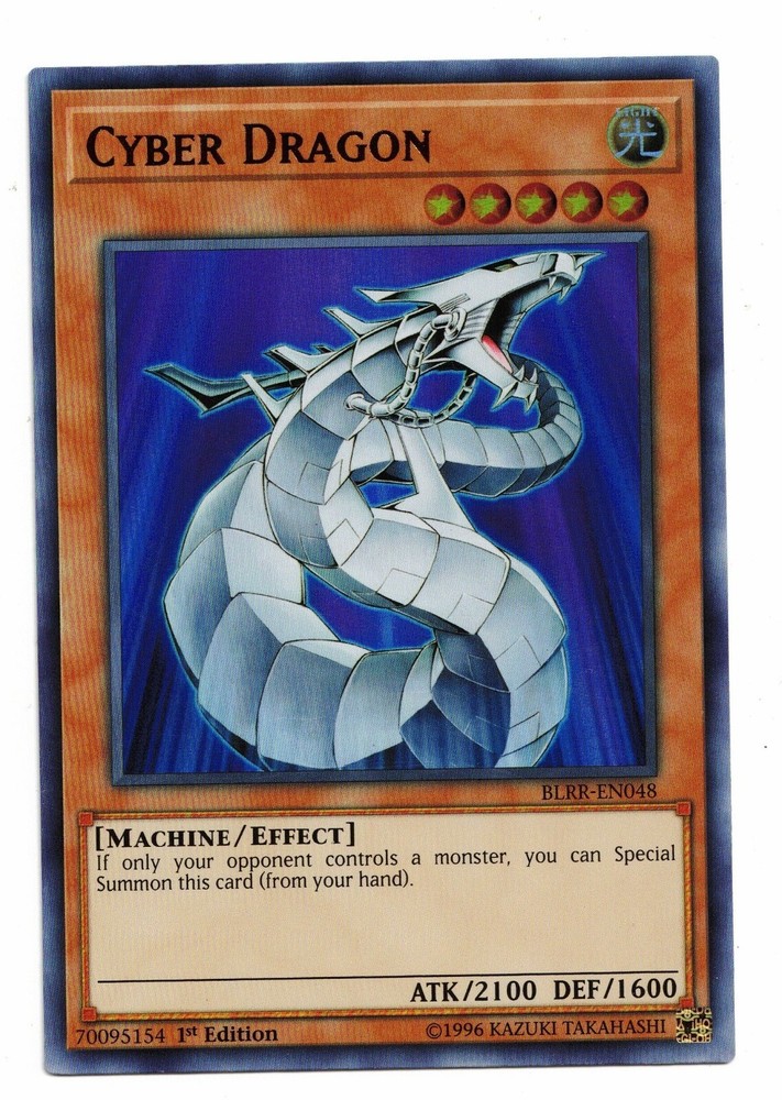 This listing is for a great Yu-Gi-Oh! Card. You get: Cyber Dragon BLRR-EN048 Ultra Rare 1st Edition! This card is in Near Mint Condition. Actual card pictured, please see scan for details. WE COMBINE SHIPPING! ORDER TOGETHER TO SAVE! CONDITION DEFINITIONS: Mint : A perfect or virtually perfect card. We do not sell cards as Mint in order to ensure customer satisfaction. Near Mint : May have some very light edge wear and/or scratching. Excellent : Edge wear and/or scratches becoming more noticeable. May have a few light indentations. Good : Shows signs of play. Has bends, scratches, indentations, minor creases, and/or increasing edge wear. Played : Severe bends, creases, edge wear and/or scratches. Damage is extremely noticeable. POKEMASTER.CARDS SALES INFORMATION: History/Background We specialize in high quality collectibles with great prices, accurate descriptions, and super fast shipping. With thousands of items sold, you can be confident that you will be very happy with your purchase! We add new items all the time, be sure to add us to your Favorite Sellers List. Click the "Save this seller" link above or in our store! Shipping Information Cards are safely packed in a protective plastic sleeve, wrapped in a packing slip, and then reinforced with cardboard and tape. Most cards are shipped via USPS First Class Mail, which usually arrives quickly (within 3-6 business days). WE COMBINE SHIPPING! Be sure to order items together to save big! Customer Service As you can see from our great feedback, we work very hard to ensure that EVERY customer is fully satisfied. Please contact us with ANY concerns BEFORE leaving feedback and we will promptly address any issue. We want 5 STARS in every category and will do what it takes to earn them.