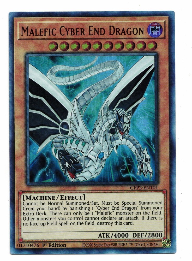This listing is for a great Yu-Gi-Oh! Card. You get: Malefic Cyber End Dragon GFP2-EN101 Ultra Rare 1st Edition! This card is in Near Mint Condition. Actual Card Pictured. Check out our other items! We add new items all the time, be sure to add us to your Favorite Sellers List. CONDITION DEFINITIONS: Mint : A perfect or virtually perfect card. We do not sell cards as Mint in order to ensure customer satisfaction. Near Mint : May have some very light edge wear and/or scratching. Excellent : Edge wear and/or scratches becoming more noticeable. May have a few light indentations. Good : Shows signs of play. Has bends, scratches, indentations, minor creases, and/or increasing edge wear. Played : Severe bends, creases, edge wear and/or scratches. Damage is extremely noticeable. POKEMASTER.CARDS SALES INFORMATION: History/Background We specialize in high quality collectibles with great prices, accurate descriptions, and super fast shipping. With thousands of items sold, you can be confident that you will be very happy with your purchase! We add new items all the time, be sure to add us to your Favorite Sellers List. Click the "Save this seller" link above or in our store! Shipping Information Cards are safely packed in a protective plastic sleeve, wrapped in a packing slip, and then reinforced with cardboard and tape. Most cards are shipped via USPS First Class Mail, which usually arrives quickly (within 3-6 business days). WE COMBINE SHIPPING! Be sure to order items together to save big! Customer Service As you can see from our great feedback, we work very hard to ensure that EVERY customer is fully satisfied. Please contact us with ANY concerns BEFORE leaving feedback and we will promptly address any issue. We want 5 STARS in every category and will do what it takes to earn them.
