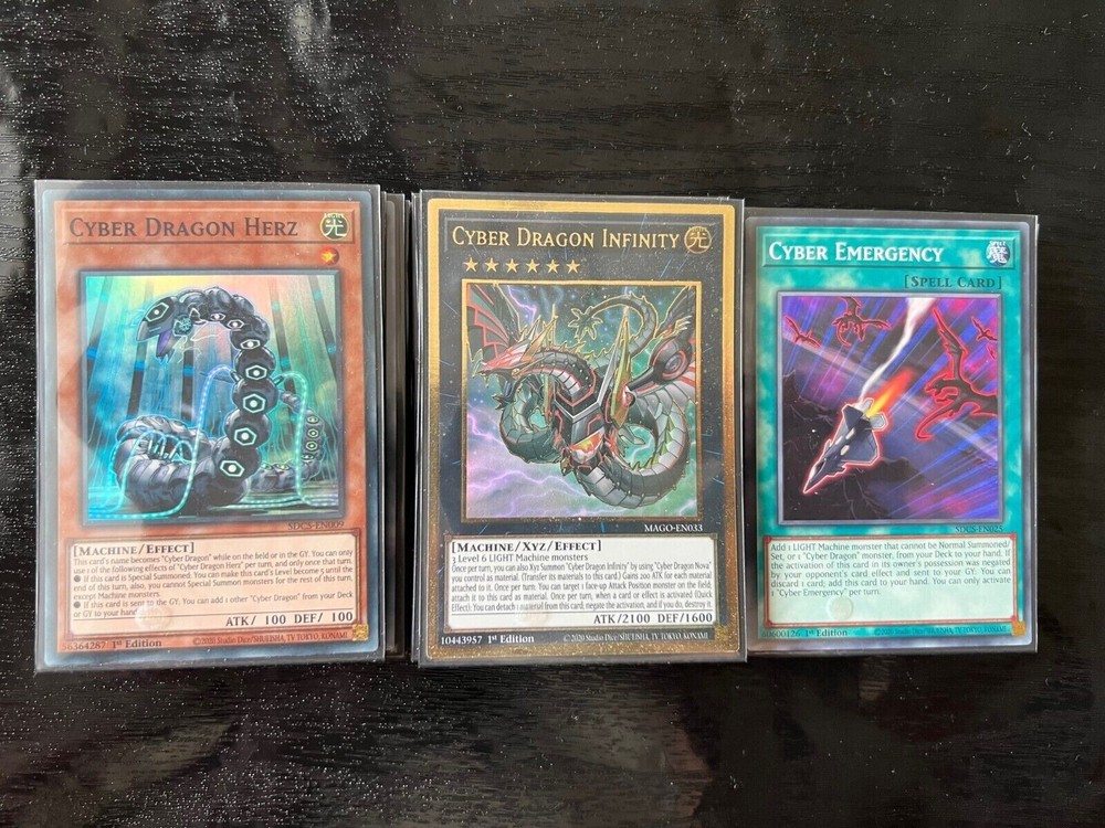 Hello all I am a New Ebay Seller!!! I am a Female Yugioh & Magic Collector!!! Happy Bidding!!! A bonus for ordering you will also Get a Free Holo Card from my collection. It maybe Super Rare, Ultra Rare, or SECRET Rare!!! Picture may have been edited due to Inventory Changes Please read description Below Shipping - All orders will be shipped with bubble mailer and a protective case. - I ship to both Domestic (U.S.) and International destinations! Please Allow me up to 10 Business days before the item will be shipped!!! Thank You!!! **If you are a international buyer, Customs Fees are the responsobility of the Buyer** Payment - Please pay within 3 days of your order to avoid an Unpaid Item Case. This just helps me run things smoothly for other bidders/buyers and myself. Will appreciate if you please leave feedback when you receive your item, and I will leave feedback as well. Contact me if anything is wrong with your order so I can have a chance to fix the issue- Your satisfaction is most important! Item for sale is: 40 CARD CYBER DRAGON DECK: Extra Deck Cards (15): 1x Cyber Dragon Infinity 1x Cyber Dragon Nova 1x Cyber Dragon Sieger 2x Chimeratech Rampage Dragon 2x Chimeratech Megafleet Dragon 2x Chimeratech Fortress Dragon 1x Cyber Eternity Dragon 1x Cyber End Dragon 1x Cyber Twin Dragon 1x Constellar Pleiades 1x Lyna the Light Charmer, Lustrous 1x Salamangreat Almiraj Monster Cards (20): 1x Therion "King" Regulus 3x Cyber Dragon Nachster 3x Cyber Dragon Herz 3x Cyber Dragon 3x Cyber Dragon Core 2x Galaxy Soldier 3x Jizukiru, the Star Destroying Kaiju 2x Dinowrestler Pankratops Spell Cards (14): 3x Clockwork Night 3x Cyber Emergency 1x Cyberload Fusion 1x Cyber Revsystem 1x Cyber Repair Plant 3x Machine Duplication 1x Power Bond 1x Overload Fusion Trap Cards (6): 1x Infinite Impermannce 2x Sour Scheduling - Red Vinegar Vamoose 3x Cybernetic Overflow u