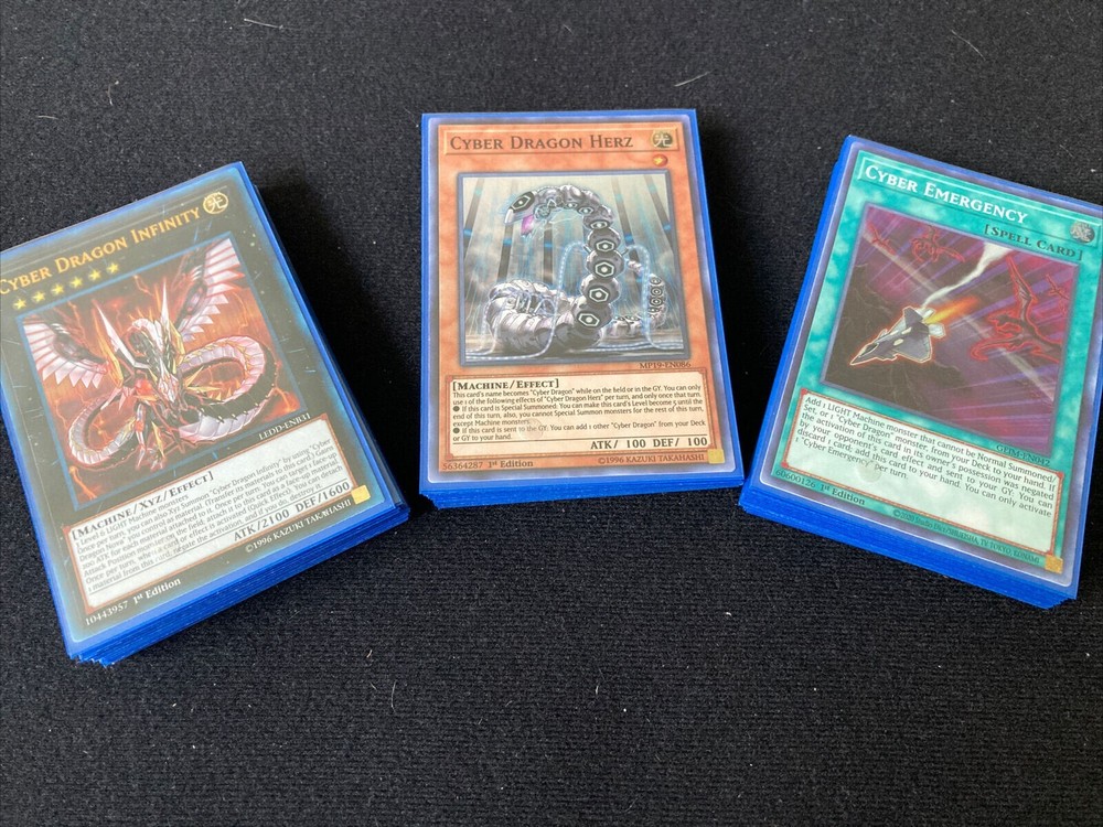 Hello!!! I am a Male Yugioh & Magic Collector & New Ebay Seller!!! I aim for 100% Customer Satisfaction so please!!! Message me about an item if you are not completely Satisfied with it. Below is the featured item if you have any questions please Message me!!! Happy Bidding!!! As a Bonus for buying my auction you will Recieve a Free Holo Card from my vast collection. It can be Super Rare, Ultra Rare, or Secret Rare or even GHOST Rare!!! Please Allow me the Set Handling time before your item will be shipped! It may take the full handling time set Thank You!!! Hello, Item for sale is: Extra Deck Cards 1x Cyber Dragon Infinity 1x Cyber Dragon Sieger 2x Chimeratech Megafleet Dragon 2x Chimeratech Rampage Dragon 1x Chimeratech Fortress Dragon 1x Cyber End Dragon 1x Cyber Dragon Nova 1x Salamangreatr Almiraj 1x Drill Driver Vespenato 1x Cyber Twin Dragon 1x Constellar Pleiades 1x Knightmare Phoenix Monster Cards 3x Cyber Dragon Nachster 3x Cyber Dragon Herz 3x Cyber Dragon Core 3x Cyber Dragon 3x Cyber Dragon Vier 3x Jizukiru, the Star Destroying Kaju Spell Cards 3x Cyber Emergency 2x Cyberload Fusion 3x Machine Duplication 3x Cyber Repair Plant 1x Overload Fusion 1x Power Bond 1x Cyber Revsystem 3x Fusion Deployment Trap Cards 3x Cybernetic Overflow