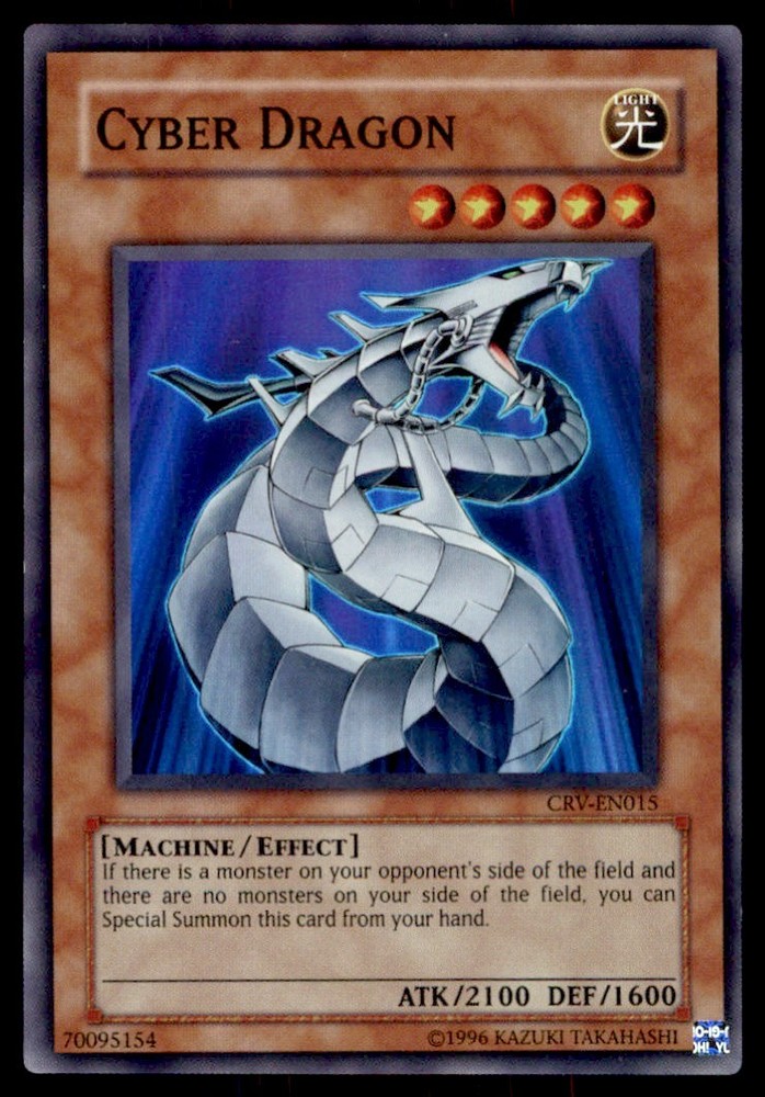 About Me Other Listings Feedback Add to Favorites Contact Me Bluenose Yu-Gi-Oh! Cyber Dragon #CVR-EN015 Light Play No stock photo / These are real scans or pictures Details Description: Cyber Dragon Category: Yugioh Year: 1996 Product: Yu-Gi-Oh! Card Number: CVR-EN015 Special: Light Play Dimensions: 3¼" x 2¼" SKU: YU B0005 R01 O (37) Payment Payment for buy it now is required immediately and for auctions it must be paid within 72 hours. Shipping Shipments usually make their way out in 1-2 business days. Returns and Claims Please view listing photo and description prior to purchase of card to make sure the card and condition is right for you! About Us Please keep in mind the following conditions .-------------------------------------------Near Mint: a card that shows very little to no signs of ware or usage such as very little whiting. -------------------------------------------Light Play: A card that shows signs of ware such as but not limited to whiting, slight bend or scratches. -------------------------------------------Heavy Play: A card that shows signs of ware, whiting, bending, creasing, folding or other various issues.-------------------------------------------Damaged: a card in very bad condition can have some or all of the above mentioned condition notes including peeling, stains, writing, etc.-------------------------------------------The photo in ads are the EXACT card you will recieve. Listing By Kronocard trading cards software v2.8.2.3