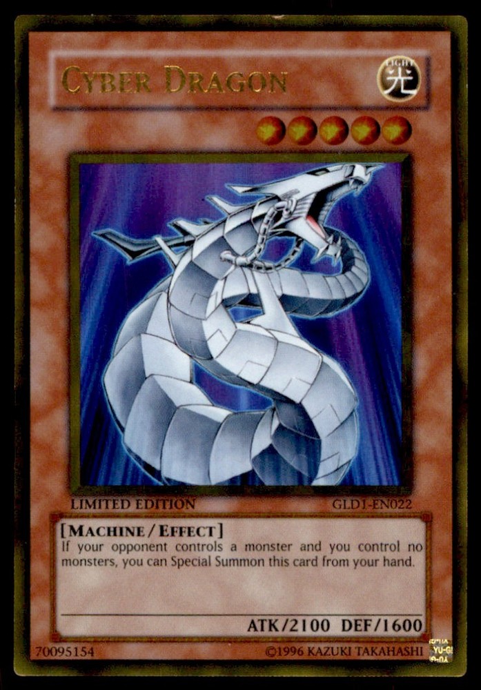 About Me Other Listings Feedback Add to Favorites Contact Me Bluenose Yu-Gi-Oh! Cyber Dragon #GLD1-EN022 Limited Edition Light Play No stock photo / These are real scans or pictures Details Description: Cyber Dragon Category: Yugioh Year: 1996 Product: Yu-Gi-Oh! Card Number: GLD1-EN022 Special: Limited Edition Light Play Dimensions: 3¼" x 2¼" SKU: YU B0005 R01 H (36) Payment Payment for buy it now is required immediately and for auctions it must be paid within 72 hours. Shipping Shipments usually make their way out in 1-2 business days. Returns and Claims Please view listing photo and description prior to purchase of card to make sure the card and condition is right for you! About Us Please keep in mind the following conditions .-------------------------------------------Near Mint: a card that shows very little to no signs of ware or usage such as very little whiting. -------------------------------------------Light Play: A card that shows signs of ware such as but not limited to whiting, slight bend or scratches. -------------------------------------------Heavy Play: A card that shows signs of ware, whiting, bending, creasing, folding or other various issues.-------------------------------------------Damaged: a card in very bad condition can have some or all of the above mentioned condition notes including peeling, stains, writing, etc.-------------------------------------------The photo in ads are the EXACT card you will recieve. Listing By Kronocard trading cards software v2.8.2.3