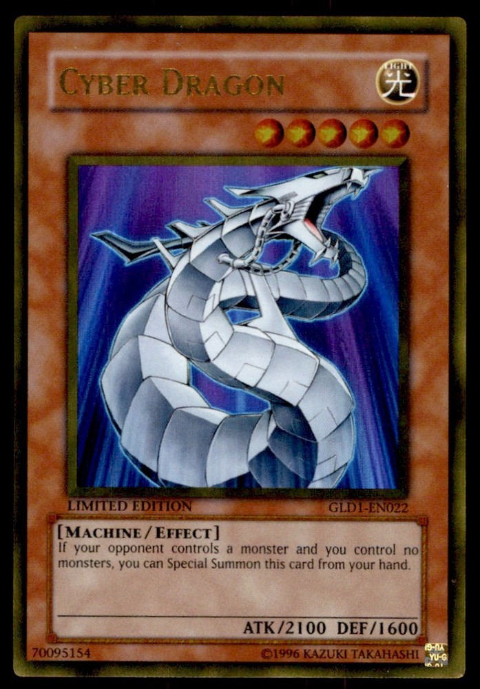 About Me Other Listings Feedback Add to Favorites Contact Me Bluenose Yu-Gi-Oh! Cyber Dragon #GLD1-EN022 Limited Edition Light Play No stock photo / These are real scans or pictures Details Description: Cyber Dragon Category: Yugioh Year: 1996 Product: Yu-Gi-Oh! Card Number: GLD1-EN022 Special: Limited Edition Light Play Dimensions: 3¼" x 2¼" SKU: YU B0005 R01 Q (33) Payment Payment for buy it now is required immediately and for auctions it must be paid within 72 hours. Shipping Shipments usually make their way out in 1-2 business days. Returns and Claims Please view listing photo and description prior to purchase of card to make sure the card and condition is right for you! About Us Please keep in mind the following conditions .-------------------------------------------Near Mint: a card that shows very little to no signs of ware or usage such as very little whiting. -------------------------------------------Light Play: A card that shows signs of ware such as but not limited to whiting, slight bend or scratches. -------------------------------------------Heavy Play: A card that shows signs of ware, whiting, bending, creasing, folding or other various issues.-------------------------------------------Damaged: a card in very bad condition can have some or all of the above mentioned condition notes including peeling, stains, writing, etc.-------------------------------------------The photo in ads are the EXACT card you will recieve. Listing By Kronocard trading cards software v2.8.2.3