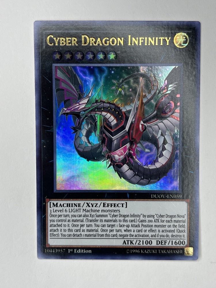 This Yu-Gi-Oh! card is a rare find for collectors and fans of the series. Featuring the Cyber Dragon Infinity, this card from the Duel Overload 1st Edition Singles set is an Ultimate Rare, 1st Edition. This card is ungraded but is in excellent condition. This card is perfect for fans of the Yu-Gi-Oh! trading card game looking to add a powerful and rare card to their deck. Comes with a card protector.