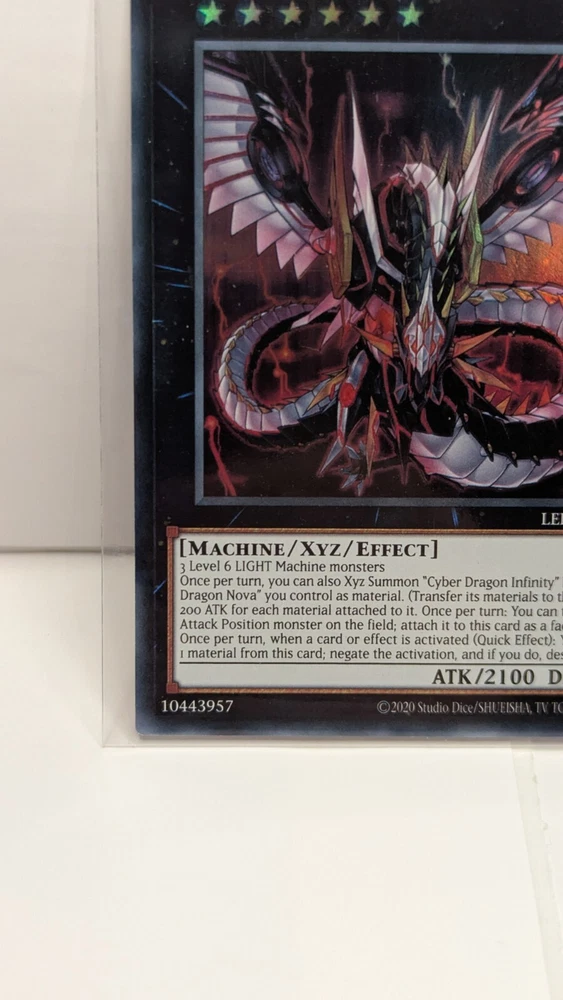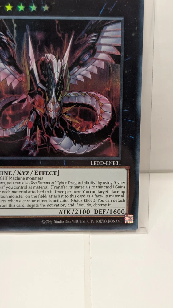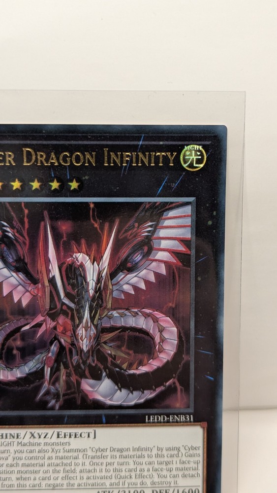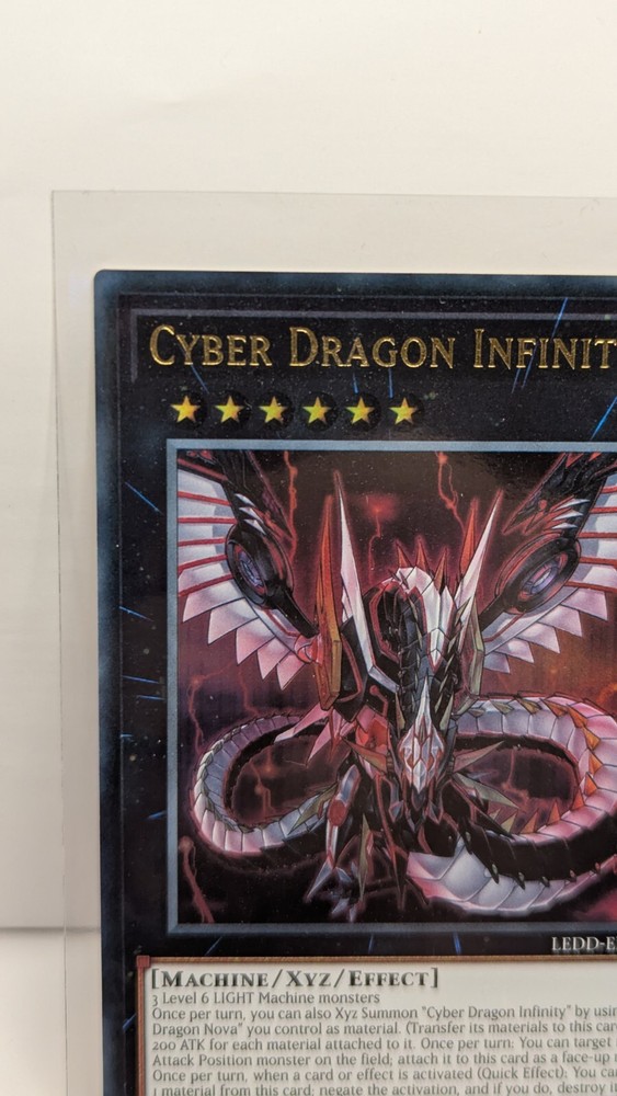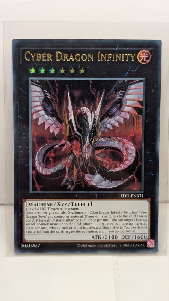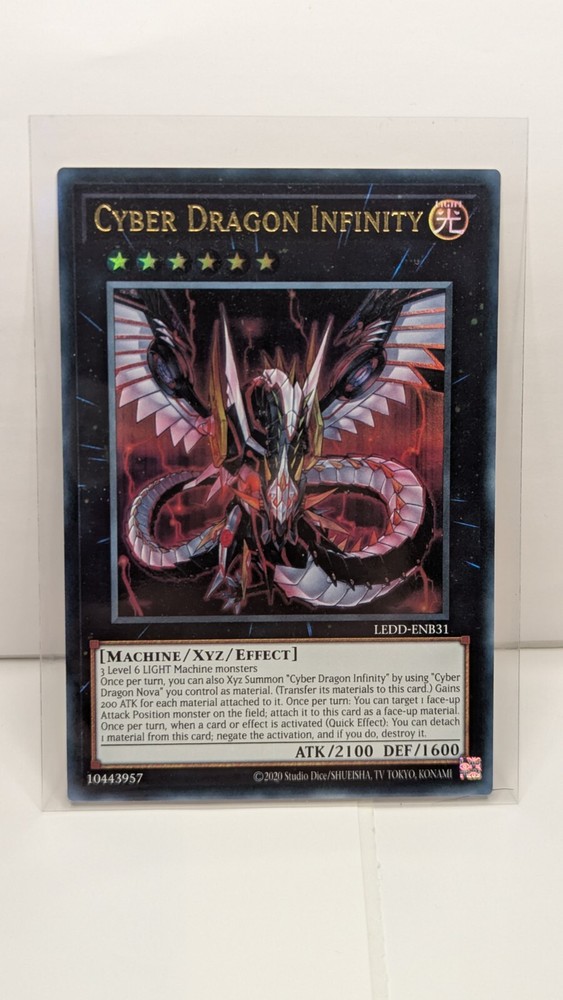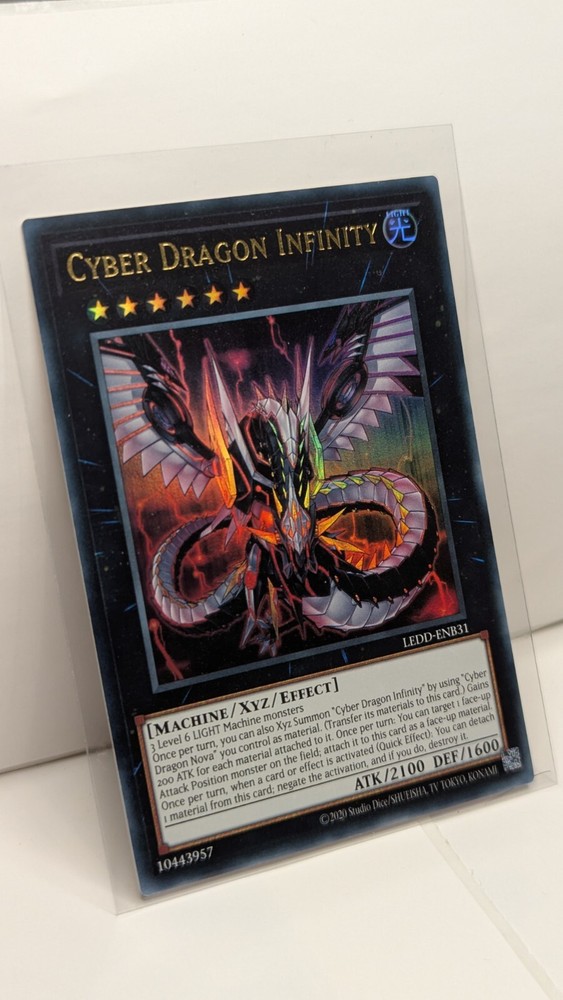 Same Day Shipping, Always Pack Fresh, Always Near Mint The product is a Yu-Gi-Oh! trading card named "Cyber Dragon Infinity" from the set Legendary Dragon Decks. This Ultra Rare card features the Attribute of Light and belongs to the Creature/Monster Type category of Machine. Manufactured by Konami in the United States in 2016, the card is in English and has a Japanese Card Size. It is an Xyz type card with a foil finish, part of the Yu-Gi-Oh! TCG game, and is part of the AlienCon event. The card is part of the Legendary Dragon Decks set and is a sought-after collectible for fans of the game.