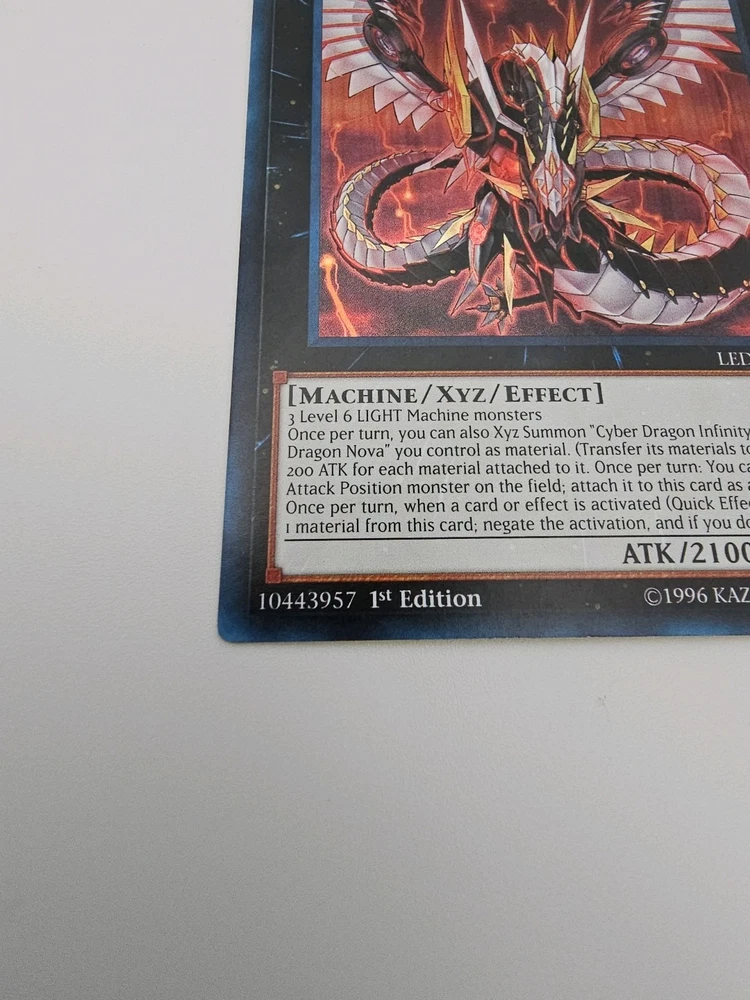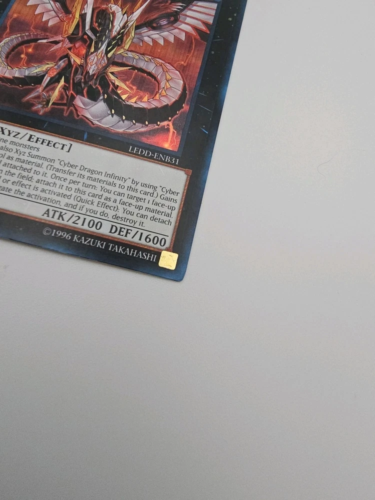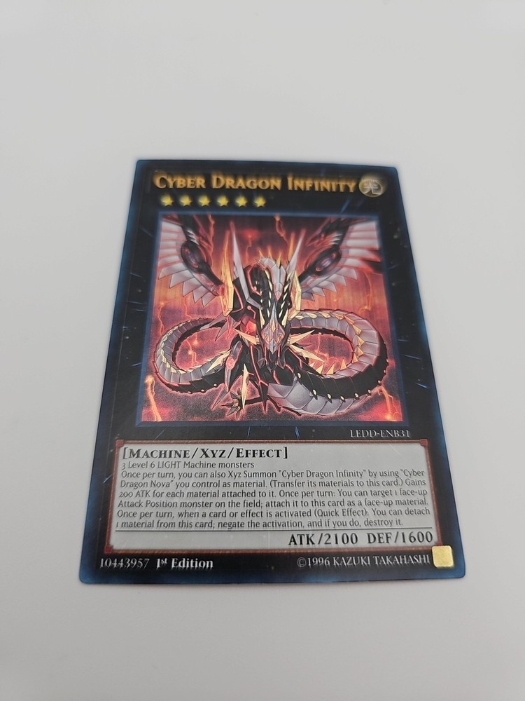 The Yu-Gi-Oh! Cyber Dragon Infinity card from the Legendary Dragon Decks set is a highly sought after collectible for fans of the Yu-Gi-Oh! Trading Card Game. With a powerful defense of 1600 and attack power of 2100, this ultra rare card features the unique attributes of a Machine creature type in the game. This 1st Edition card, manufactured by Konami, is a valuable addition to any collector's deck, showcasing the intricate design and strategic gameplay that the Yu-Gi-Oh! TCG is known for.