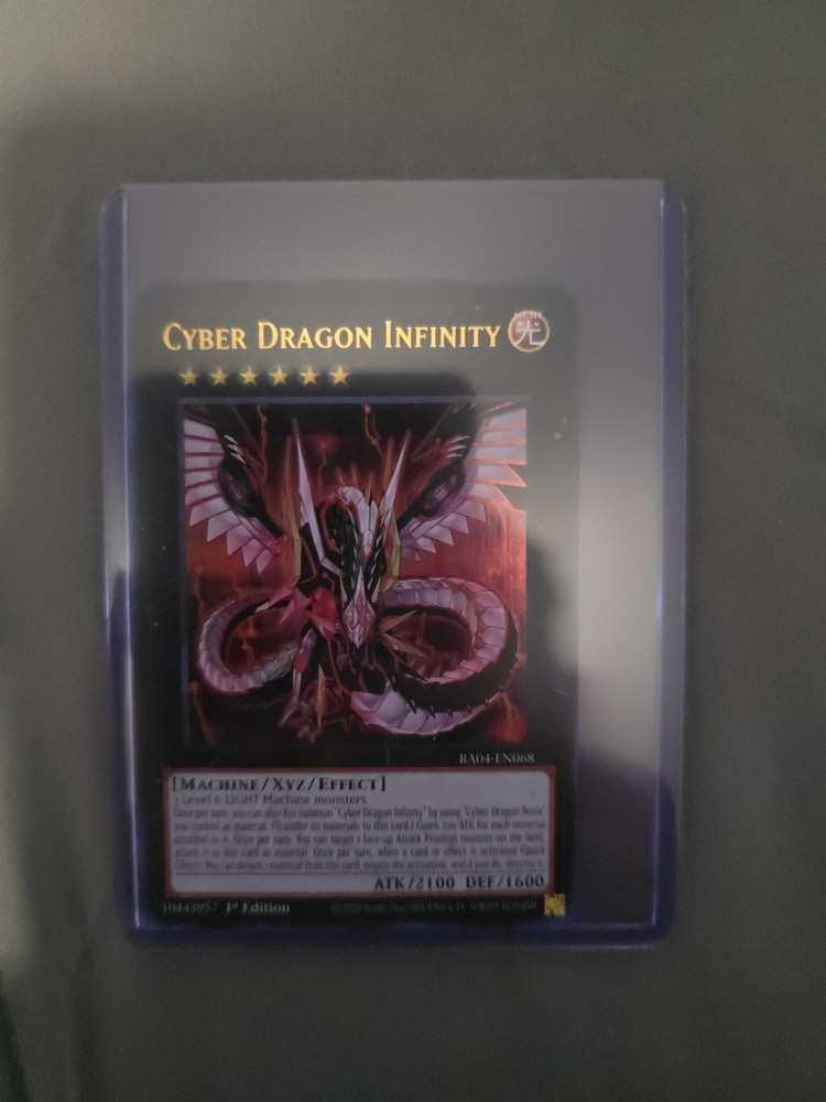 Card Name: Cyber Dragon Infinity Rarity: Quarter Century Secret Rare Set: 25th Anniversary Rarity Collection Edition: 1st Edition Condition: Near Mint (NM) – see photos for details Language: English Authentic Konami Yu-Gi-Oh! TCG card Add this iconic XYZ monster to your collection with this stunning 25th Anniversary Quarter Century Secret Rare edition. A must-have for collectors and competitive players. Ships securely in sleeve and top loader. Feel free to message with questions!