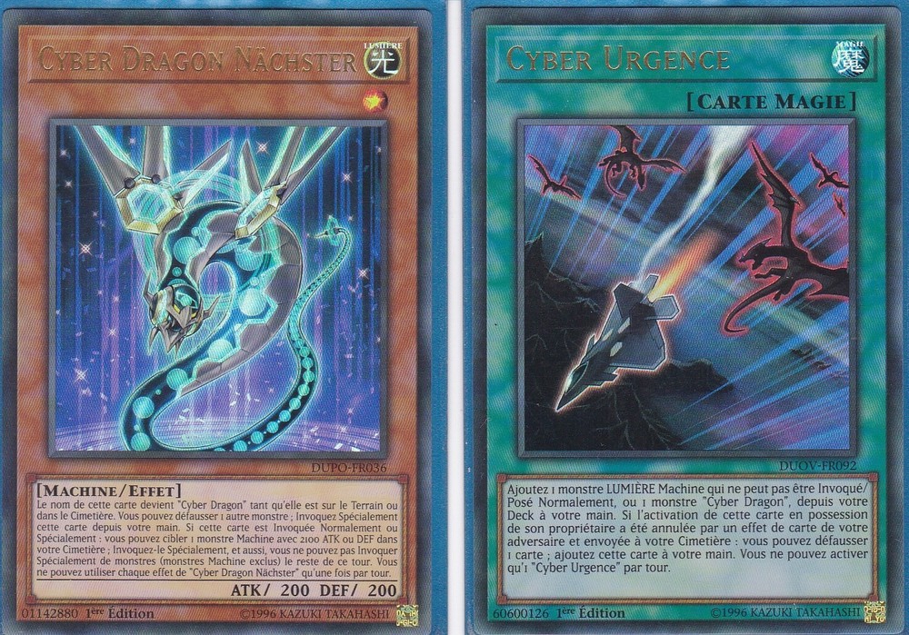 Vous enchérissez sur l'objet suivant : Yu-Gi-Oh! Lot de 2 cartes indispensables dans un deck Cyber Dragon Machine : - Cyber Dragon Nächster (DUPO-FR036) 1ère Edition Ultra Rare COMME NEUF + - Cyber Urgence (DUOV-FR092) 1ère Edition Ultra Rare COMME NEUF !! Les 2 cartes sont comme neuves, n'ont jamais été jouées et ont été placées sous protection dès leur sortie du booster. Elles vous seront envoyées dans les 3 jours ouvrés suivant la fin de la vente par Lettre Suivie après avoir été protégées de façon optimale à l'aide d'un top-loadder (protection en plastique rigide). N'hésitez pas à consulter mes autres objets mis en vente ! Etant donné que la nouvelle directive européenne prévoit désormais une garantie d'un an même pour les ventes privées - dans la mesure où le vendeur ne l'exclut pas - je déclare ne pas fournir de garantie pour mes articles vendus. Avec l'achat de la marchandise, vous acceptez expressément de renoncer à la garantie. Sur tous les articles neufs et d'occasion achetés chez moi, il n' y a pas de droit de rétractation, aucune garantie, aucun retour ou aucun échange. Chacun de mes envois est expédié avec un numéro de suivi après avoir été protégé de façon optimale mais je ne suis pas responsable des éventuels défauts qui existaient avant l'expédition et je n'assume aucune responsabilité ou frais pour les pertes et / ou dommages durant le transport.
