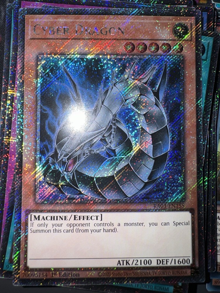This Yu-Gi-Oh! TCG card is a must-have for collectors and players alike. The Cyber Dragon RA03-EN155 1st Edition Platinum Secret Rare NM card features a stunning holo finish and is in English language. It is a monster card with a standard size, suitable for players aged 6+. The card is manufactured by Konami and is perfect for those who love the Yu-Gi-Oh! TCG game. It is a rare card, with a Platinum Secret Rare rarity, and is not autographed. This card is ideal for those who are looking to complete their collection or enhance their deck.