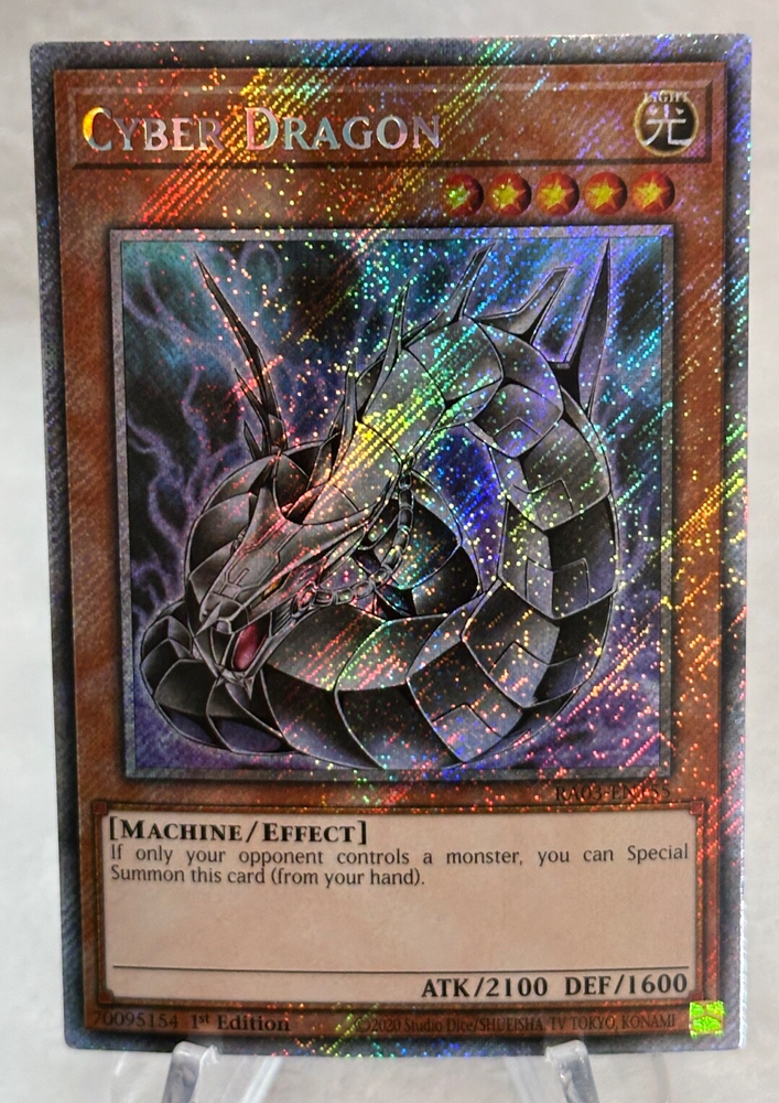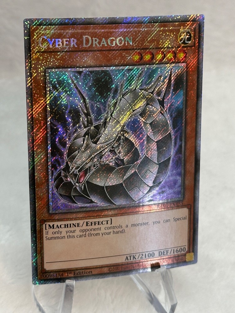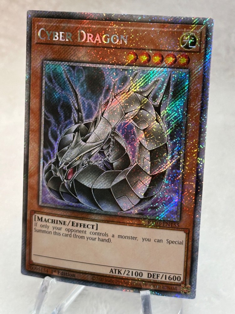 The product is a Yu-Gi-Oh! TCG card from the Quarter Century Bonanza set, released in 2024. It features the Cyber Dragon card with a Platinum Secret Rare 1st Edition print, manufactured by Konami. The card is an Effect type with an impressive Attack/Power of 2100 and Defense/Toughness of 1600, making it a formidable addition to any Yu-Gi-Oh! collection. With its Light attribute and Machine monster type, this Cyber Dragon card is a valuable and sought-after item for fans and players alike. This item has never been played, opened from fresh pack to sleeve. Please see all photos for any flaws. This item will ship in clear card sleeve inside a top loader. Please send a message with any questions. Thanks for viewing my listing.