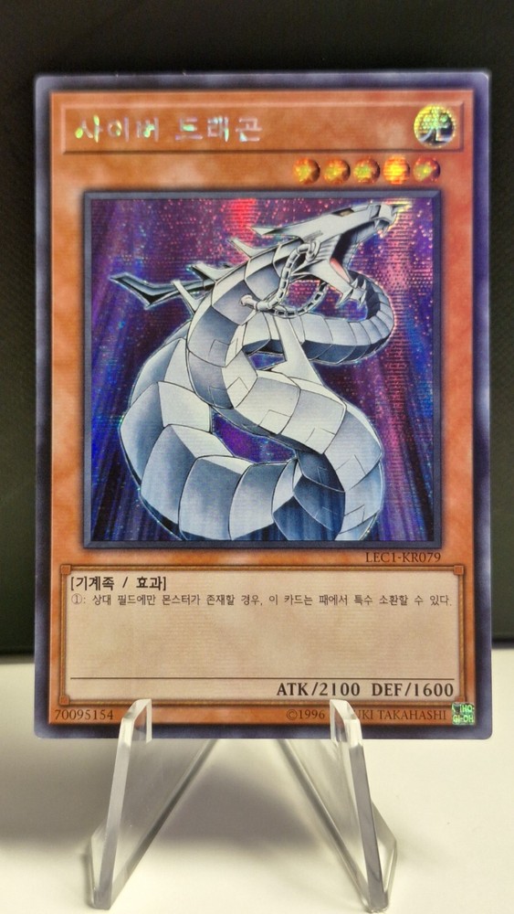 This Yu-Gi-Oh! Cyber Dragon card is a rare find for collectors. It features a holographic finish and is a secret rare card from the Yugi set. The card type is effect and it is printed on high-quality card stock material. It is a Korean version manufactured by Konami, making it a unique addition to any Yu-Gi-Oh! TCG collection. The card name is Cyber Dragon and it is a must-have for any fan of the series. This card is perfect for those who appreciate the artistry and rarity of collectible card games. It's a great opportunity to add something special to your collection, and it's sure to become a prized possession.