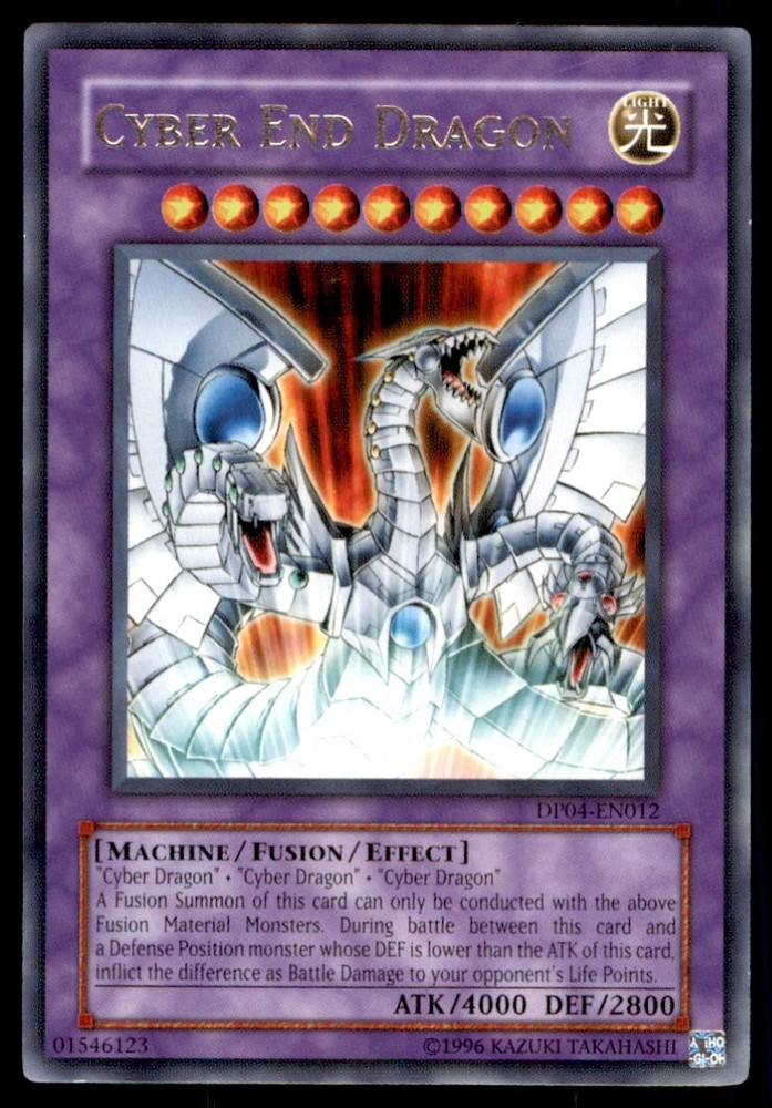 About Me Other Listings Feedback Add to Favorites Contact Me Bluenose Yu-Gi-Oh! Cyber End Dragon #DP04-EN012 Light Play No stock photo / These are real scans or pictures Details Description: Cyber End Dragon Category: Yugioh Year: 1996 Product: Yu-Gi-Oh! Card Number: DP04-EN012 Special: Light Play Dimensions: 3¼" x 2¼" SKU: YU B0003 R04 F (5) Payment Payment for buy it now is required immediately and for auctions it must be paid within 72 hours. Shipping Shipments usually make their way out in 3 business days. All orders to USA under 800$ USD typically are NOT subject to import or duty! We also offer free shipping on all our cards for north america. Returns and Claims Please view listing photo and description prior to purchase of card to make sure the card and condition is right for you! About Us Please keep in mind the following conditions .-------------------------------------------Near Mint: a card that shows very little to no signs of ware or usage such as very little whiting. -------------------------------------------Light Play: A card that shows signs of ware such as but not limited to whiting, slight bend or scratches. -------------------------------------------Heavy Play: A card that shows signs of ware, whiting, bending, creasing, folding or other various issues.-------------------------------------------Damaged: a card in very bad condition can have some or all of the above mentioned condition notes including peeling, stains, writing, etc.-------------------------------------------The photo in ads are the EXACT card you will recieve. Listing By Kronocard trading cards software v2.7.0.1 Update ? March 3rd, 2025