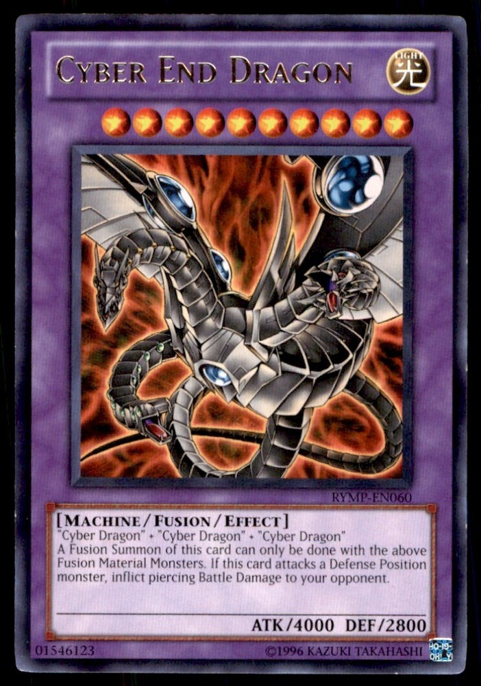 About Me Other Listings Feedback Add to Favorites Contact Me Bluenose Yu-Gi-Oh! Cyber End Dragon #RYMP-EN060 Light Play No stock photo / These are real scans or pictures Details Description: Cyber End Dragon Category: Yugioh Year: 1996 Product: Yu-Gi-Oh! Card Number: RYMP-EN060 Special: Light Play Dimensions: 3¼" x 2¼" SKU: YU B0003 R03 V (41) Payment Payment for buy it now is required immediately and for auctions it must be paid within 72 hours. Shipping Shipments usually make their way out in 3 business days. All orders to USA under 800$ USD typically are NOT subject to import or duty! We also offer free shipping on all our cards for north america. Returns and Claims Please view listing photo and description prior to purchase of card to make sure the card and condition is right for you! About Us Please keep in mind the following conditions .-------------------------------------------Near Mint: a card that shows very little to no signs of ware or usage such as very little whiting. -------------------------------------------Light Play: A card that shows signs of ware such as but not limited to whiting, slight bend or scratches. -------------------------------------------Heavy Play: A card that shows signs of ware, whiting, bending, creasing, folding or other various issues.-------------------------------------------Damaged: a card in very bad condition can have some or all of the above mentioned condition notes including peeling, stains, writing, etc.-------------------------------------------The photo in ads are the EXACT card you will recieve. Listing By Kronocard trading cards software v2.7.0.1