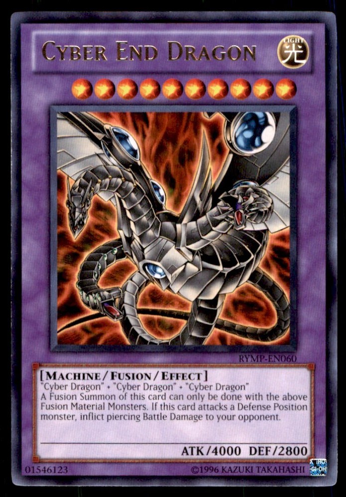 About Me Other Listings Feedback Add to Favorites Contact Me Bluenose Yu-Gi-Oh! Cyber End Dragon #RYMP-EN060 Light Play No stock photo / These are real scans or pictures Details Description: Cyber End Dragon Category: Yugioh Year: 1996 Product: Yu-Gi-Oh! Card Number: RYMP-EN060 Special: Light Play Dimensions: 3¼" x 2¼" SKU: YU B0003 R04 I (47) Payment Payment for buy it now is required immediately and for auctions it must be paid within 72 hours. Shipping Shipments usually make their way out in 3 business days. All orders to USA under 800$ USD typically are NOT subject to import or duty! We also offer free shipping on all our cards for north america. Returns and Claims Please view listing photo and description prior to purchase of card to make sure the card and condition is right for you! About Us Please keep in mind the following conditions .-------------------------------------------Near Mint: a card that shows very little to no signs of ware or usage such as very little whiting. -------------------------------------------Light Play: A card that shows signs of ware such as but not limited to whiting, slight bend or scratches. -------------------------------------------Heavy Play: A card that shows signs of ware, whiting, bending, creasing, folding or other various issues.-------------------------------------------Damaged: a card in very bad condition can have some or all of the above mentioned condition notes including peeling, stains, writing, etc.-------------------------------------------The photo in ads are the EXACT card you will recieve. Listing By Kronocard trading cards software v2.7.0.1