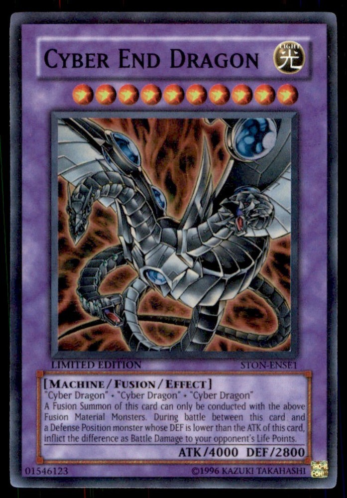 About Me Other Listings Feedback Add to Favorites Contact Me Bluenose Yu-Gi-Oh! Cyber End Dragon #STON-ENSE1 Light Play No stock photo / These are real scans or pictures Details Description: Cyber End Dragon Category: Yugioh Year: 1996 Product: Yu-Gi-Oh! Card Number: STON-ENSE1 Special: Light Play Dimensions: 3¼" x 2¼" SKU: YU B0003 R02 I (9) Payment Payment for buy it now is required immediately and for auctions it must be paid within 72 hours. Shipping Shipments usually make their way out in 3 business days. All orders to USA under 800$ USD typically are NOT subject to import or duty! We also offer free shipping on all our cards for north america. Returns and Claims Please view listing photo and description prior to purchase of card to make sure the card and condition is right for you! About Us Please keep in mind the following conditions .-------------------------------------------Near Mint: a card that shows very little to no signs of ware or usage such as very little whiting. -------------------------------------------Light Play: A card that shows signs of ware such as but not limited to whiting, slight bend or scratches. -------------------------------------------Heavy Play: A card that shows signs of ware, whiting, bending, creasing, folding or other various issues.-------------------------------------------Damaged: a card in very bad condition can have some or all of the above mentioned condition notes including peeling, stains, writing, etc.-------------------------------------------The photo in ads are the EXACT card you will recieve. Listing By Kronocard trading cards software v2.7.0.1