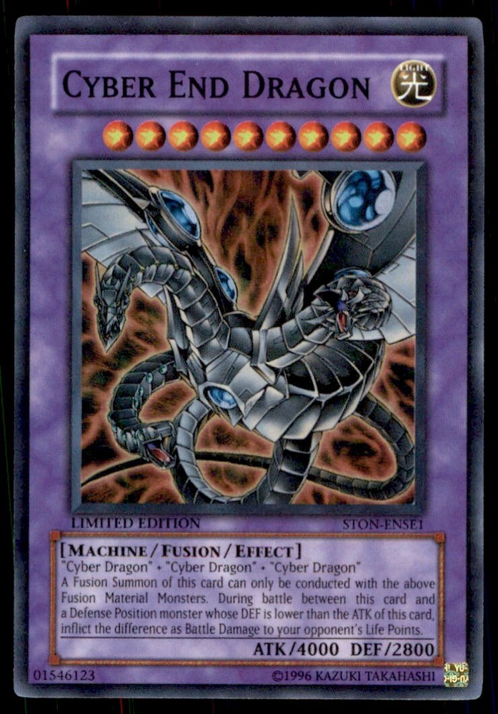 About Me Other Listings Feedback Add to Favorites Contact Me Bluenose Yu-Gi-Oh! Cyber End Dragon #STON-ENSE1 Light Play No stock photo / These are real scans or pictures Details Description: Cyber End Dragon Category: Yugioh Year: 1996 Product: Yu-Gi-Oh! Card Number: STON-ENSE1 Special: Light Play Dimensions: 3¼" x 2¼" SKU: YU B0003 R02 K (10) Payment Payment for buy it now is required immediately and for auctions it must be paid within 72 hours. Shipping Shipments usually make their way out in 3 business days. All orders to USA under 800$ USD typically are NOT subject to import or duty! We also offer free shipping on all our cards for north america. Returns and Claims Please view listing photo and description prior to purchase of card to make sure the card and condition is right for you! About Us Please keep in mind the following conditions .-------------------------------------------Near Mint: a card that shows very little to no signs of ware or usage such as very little whiting. -------------------------------------------Light Play: A card that shows signs of ware such as but not limited to whiting, slight bend or scratches. -------------------------------------------Heavy Play: A card that shows signs of ware, whiting, bending, creasing, folding or other various issues.-------------------------------------------Damaged: a card in very bad condition can have some or all of the above mentioned condition notes including peeling, stains, writing, etc.-------------------------------------------The photo in ads are the EXACT card you will recieve. Listing By Kronocard trading cards software v2.7.0.1