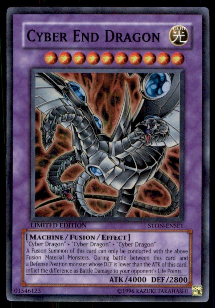 About Me Other Listings Feedback Add to Favorites Contact Me Bluenose Yu-Gi-Oh! Cyber End Dragon #STON-ENSE1 Light Play No stock photo / These are real scans or pictures Details Description: Cyber End Dragon Category: Yugioh Year: 1996 Product: Yu-Gi-Oh! Card Number: STON-ENSE1 Special: Light Play Dimensions: 3¼" x 2¼" SKU: YU B0003 R02 N (6) Payment Payment for buy it now is required immediately and for auctions it must be paid within 72 hours. Shipping Shipments usually make their way out in 3 business days. All orders to USA under 800$ USD typically are NOT subject to import or duty! We also offer free shipping on all our cards for north america. Returns and Claims Please view listing photo and description prior to purchase of card to make sure the card and condition is right for you! About Us Please keep in mind the following conditions .-------------------------------------------Near Mint: a card that shows very little to no signs of ware or usage such as very little whiting. -------------------------------------------Light Play: A card that shows signs of ware such as but not limited to whiting, slight bend or scratches. -------------------------------------------Heavy Play: A card that shows signs of ware, whiting, bending, creasing, folding or other various issues.-------------------------------------------Damaged: a card in very bad condition can have some or all of the above mentioned condition notes including peeling, stains, writing, etc.-------------------------------------------The photo in ads are the EXACT card you will recieve. Listing By Kronocard trading cards software v2.7.0.1